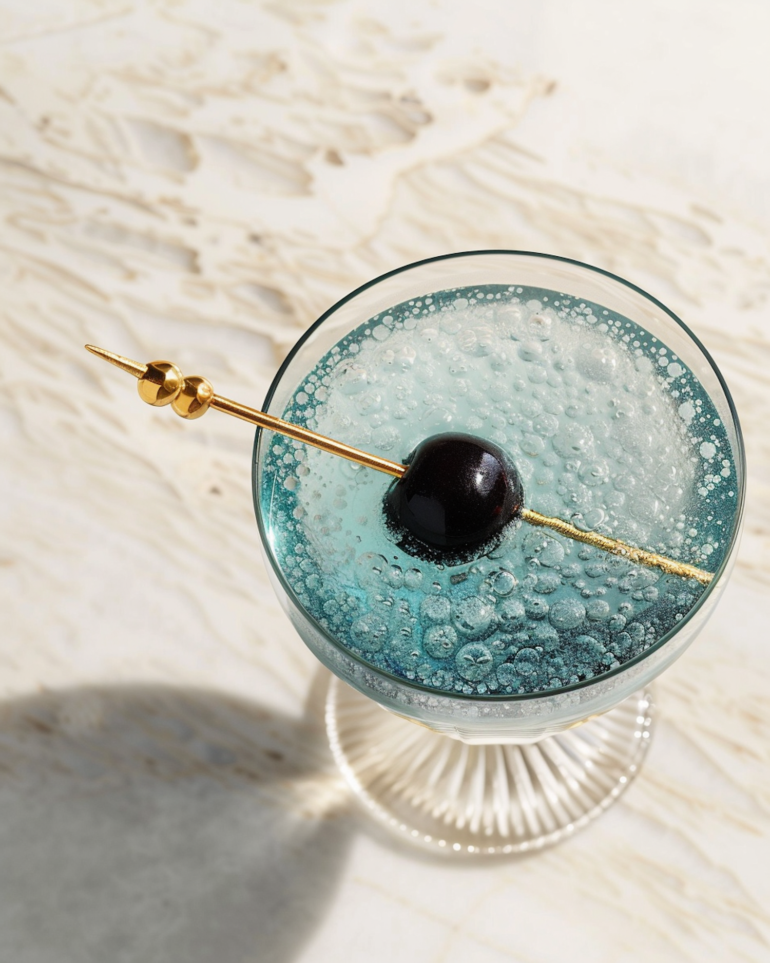 Elegant cocktail with a blue bubbly drink, garnished with a cherry on a gold pick, set on a marbled surface.