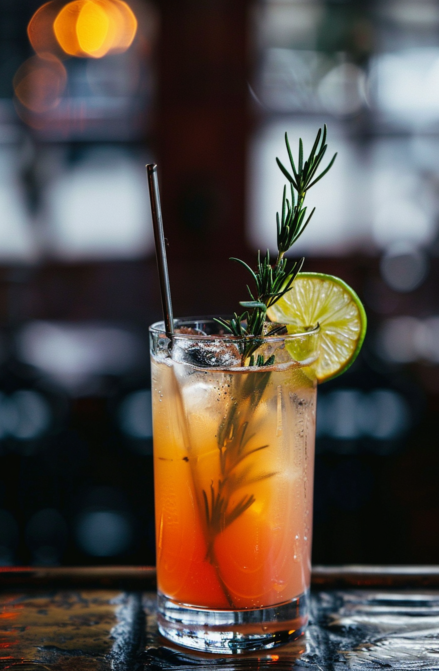 Refreshing cocktail with orange hues, rosemary garnish, lime wheel, and metal straw, set against a warm, blurred background.