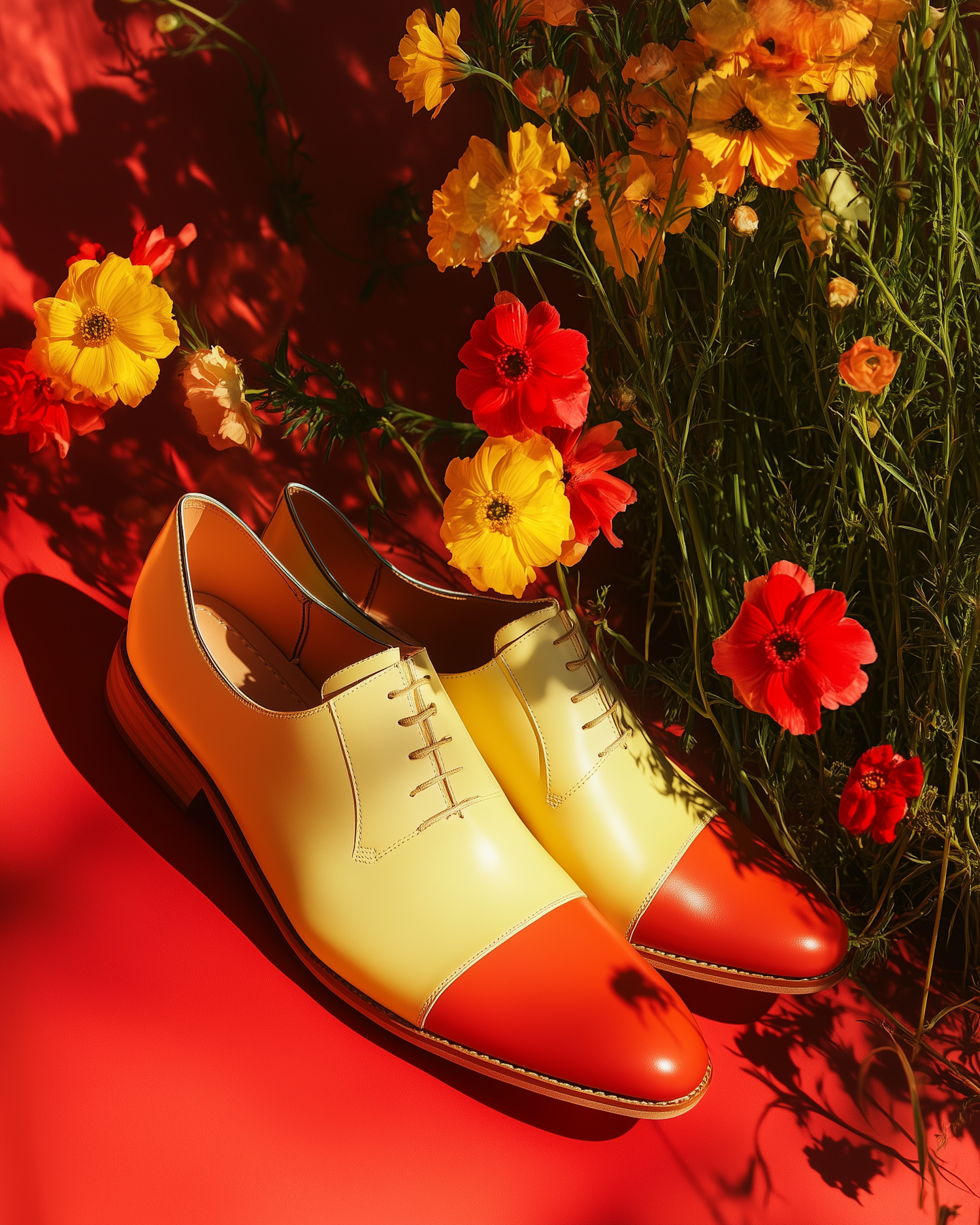 Vibrant oxford shoes in yellow and red with colorful flowers on a red background, creating a lively and stylish scene.