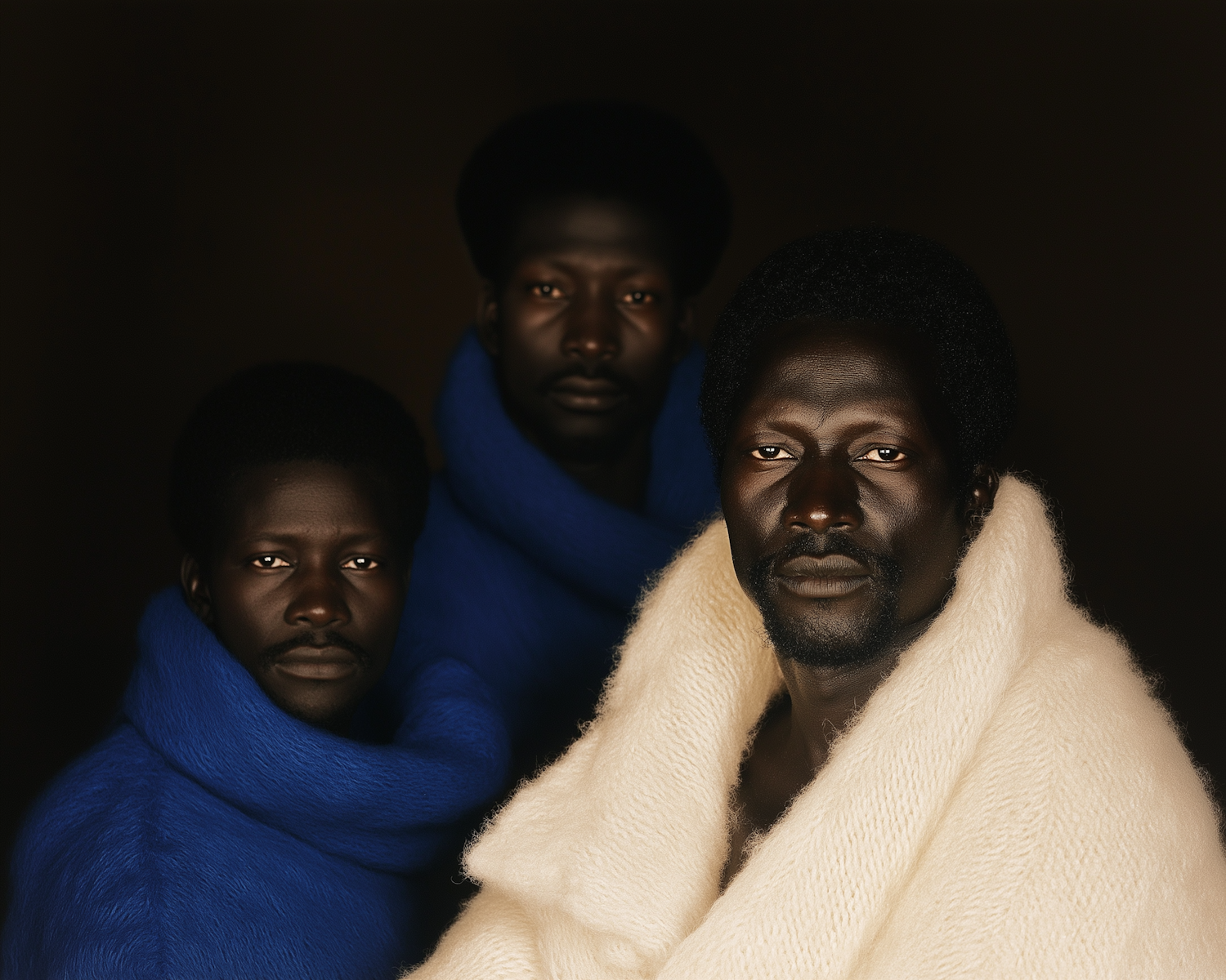 Three men in vibrant blue and cream garments pose against a dark background, creating a striking contrast and serene composition.