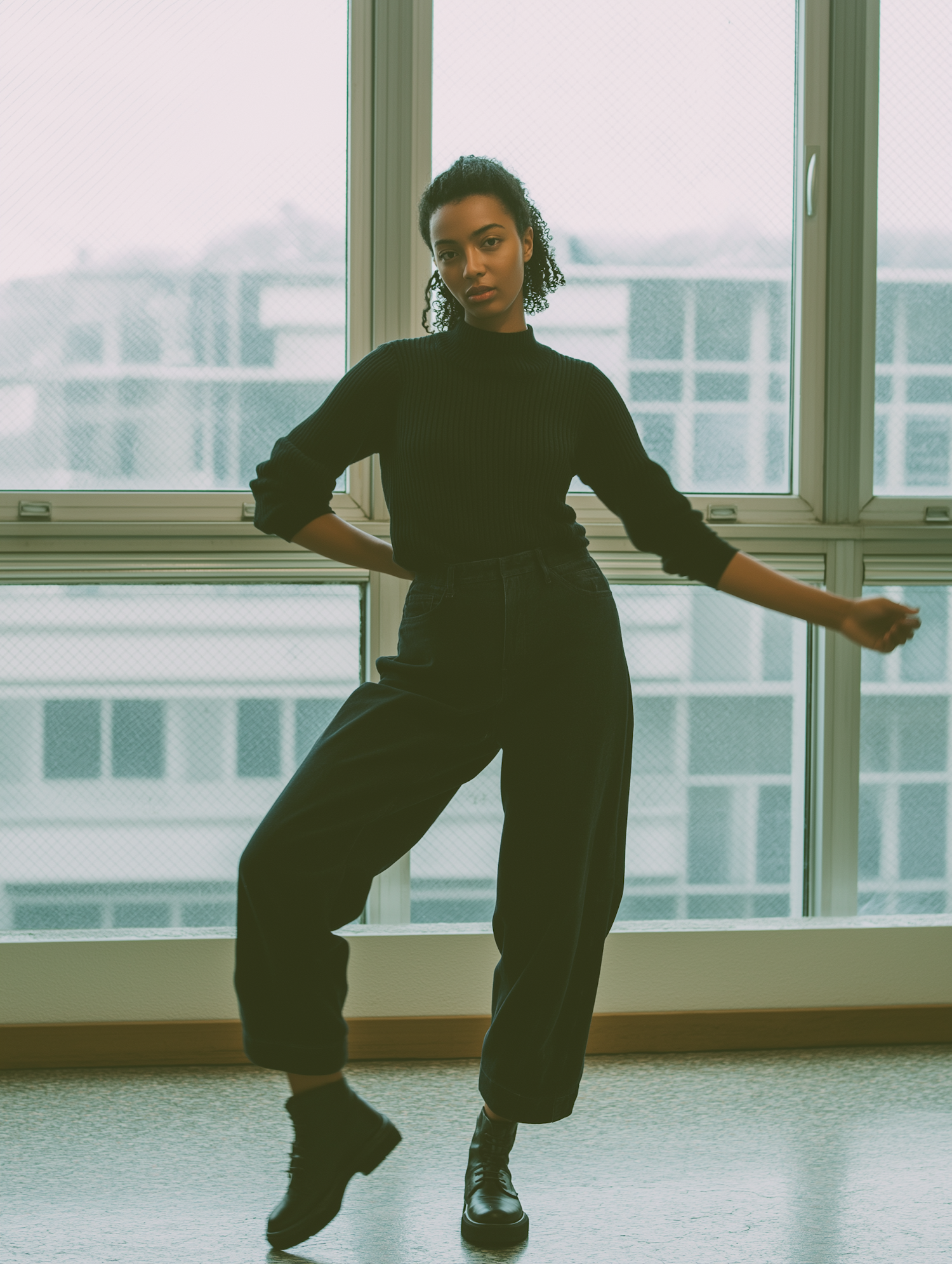 Stylish individual posing confidently indoors against large windows with a muted urban view in the background.