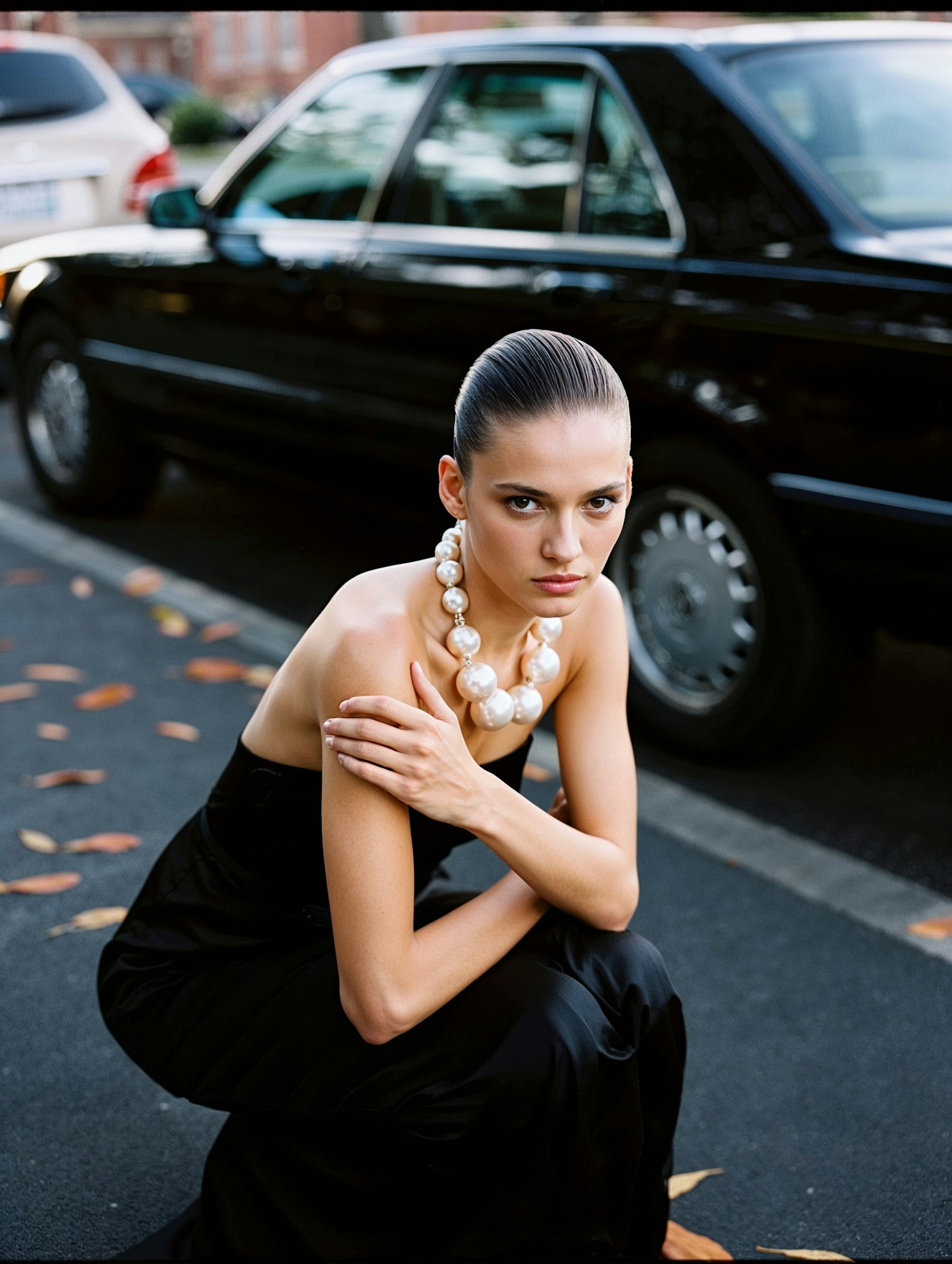 A woman in a black dress and pearl necklace crouches on a city street, with parked cars and autumn leaves in the background.
