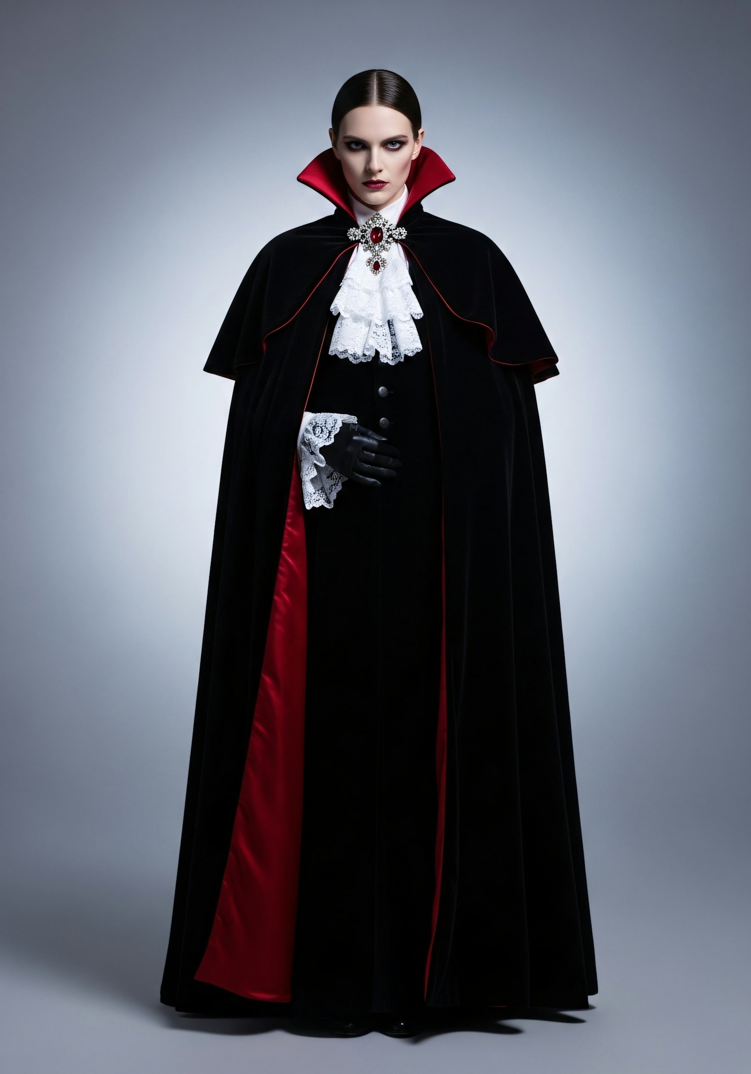A person in a dramatic vampire costume with a black cape, red lining, and lace details, exuding a gothic and elegant aesthetic.