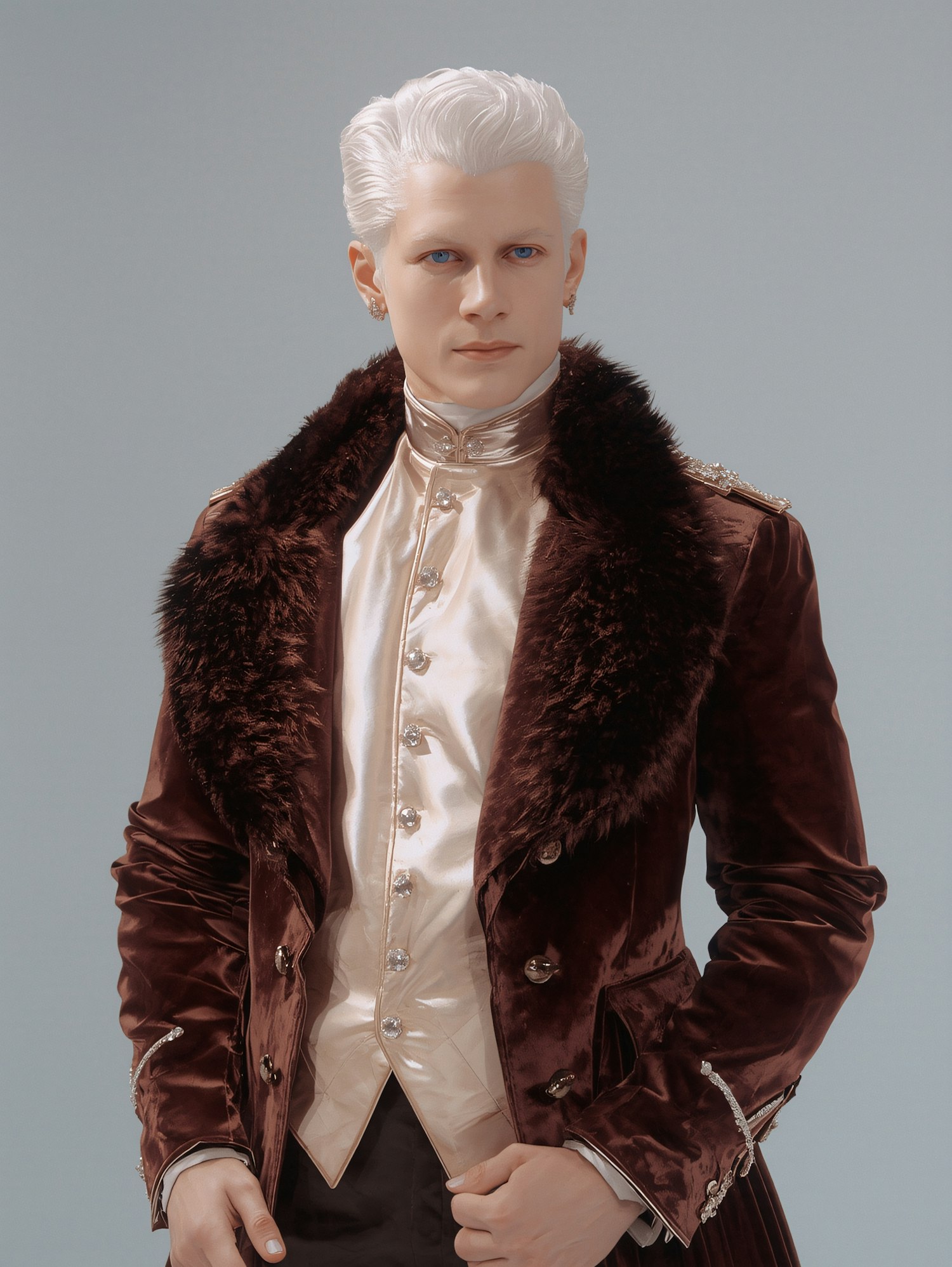 A person in a burgundy velvet coat with fur trim and a satin shirt, styled with white hair and blue eyes, against a plain background.