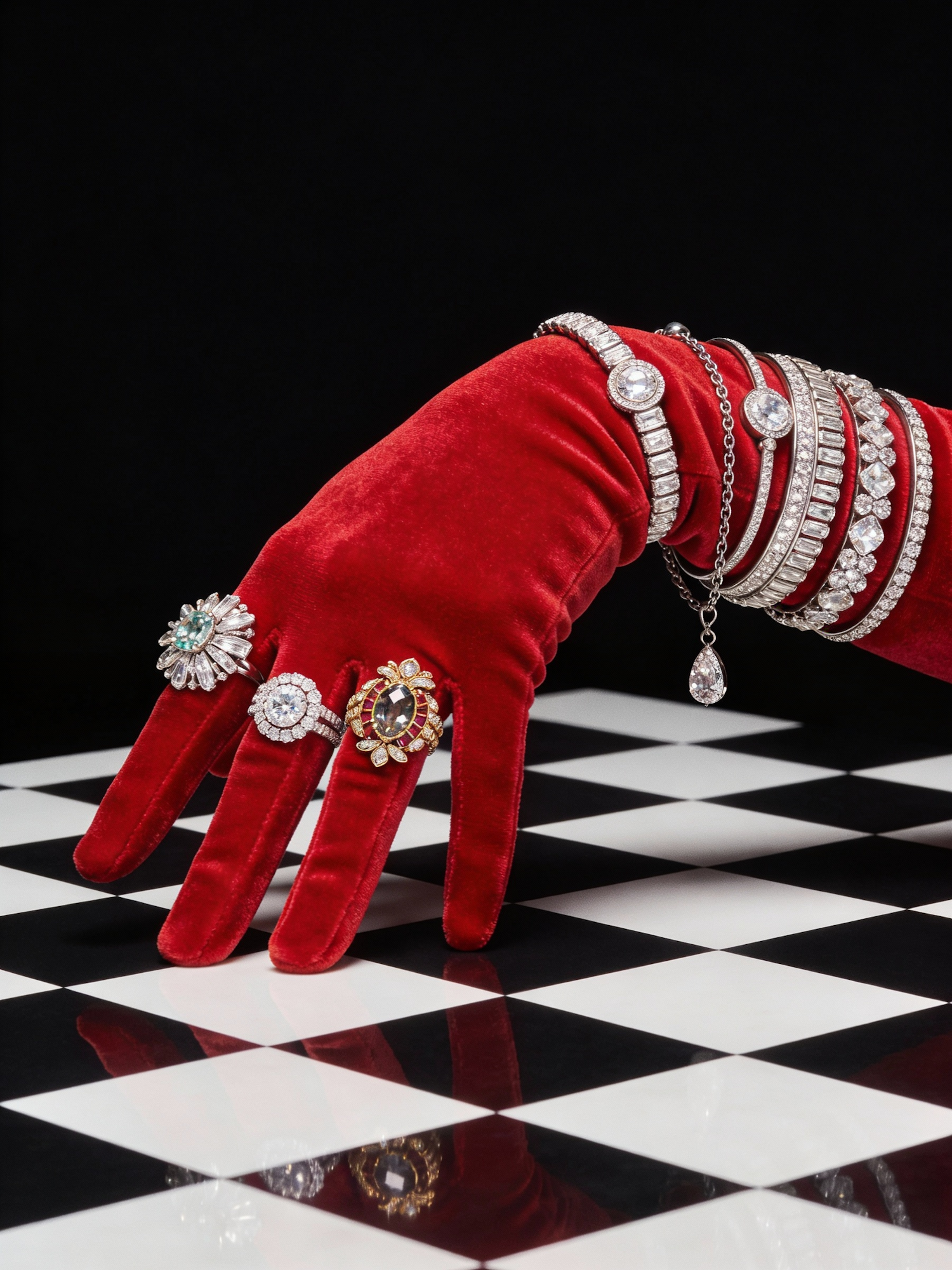 A red velvet glove with sparkling rings and bracelets on a checkered surface, showcasing luxury and elegance against a black background.