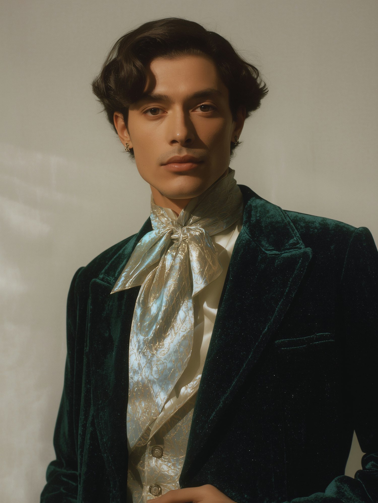 A person in a green velvet jacket and silk cravat, exuding elegance and sophistication against a neutral background.
