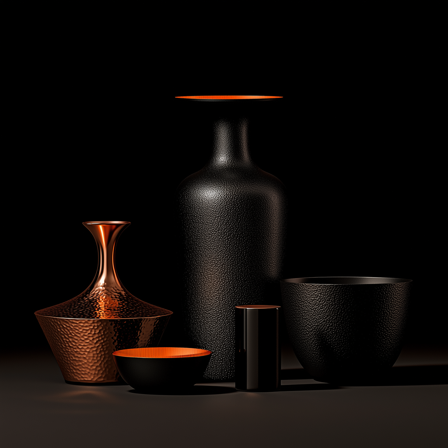 Elegant black and copper vessels with textured surfaces and orange accents, beautifully arranged against a dark background.