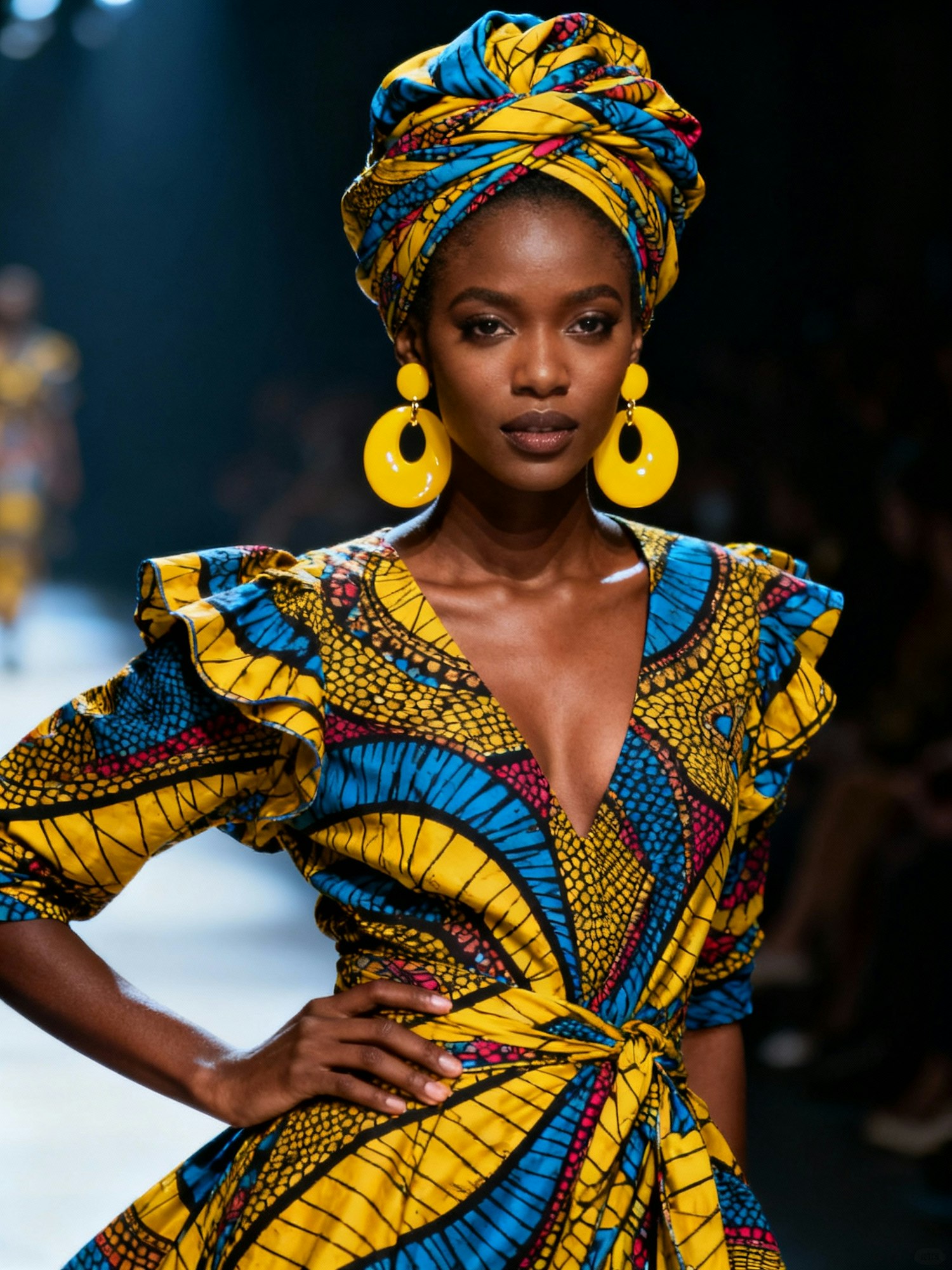 A model in a vibrant yellow and blue patterned dress with a matching headwrap and bold yellow earrings on a dimly lit runway.