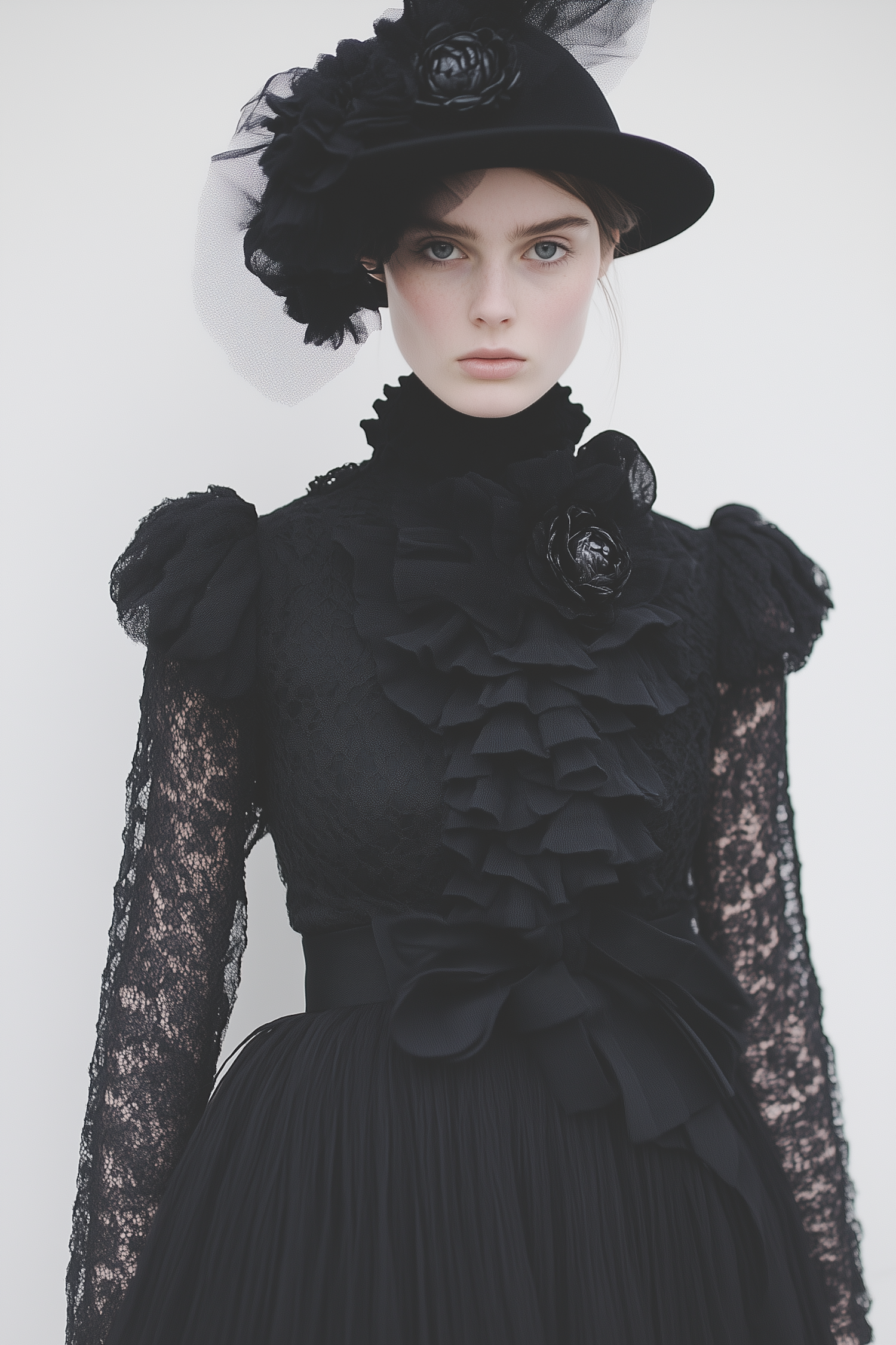 Elegant woman in vintage black lace dress and hat with flower detail, exuding sophistication and timeless style.