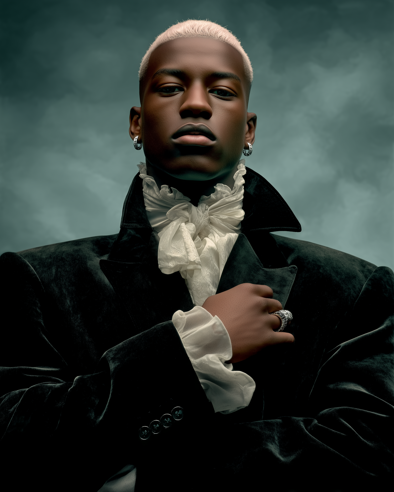 A striking portrait of a person in vintage attire, featuring a black velvet jacket and white ruffled shirt, set against a teal background.
