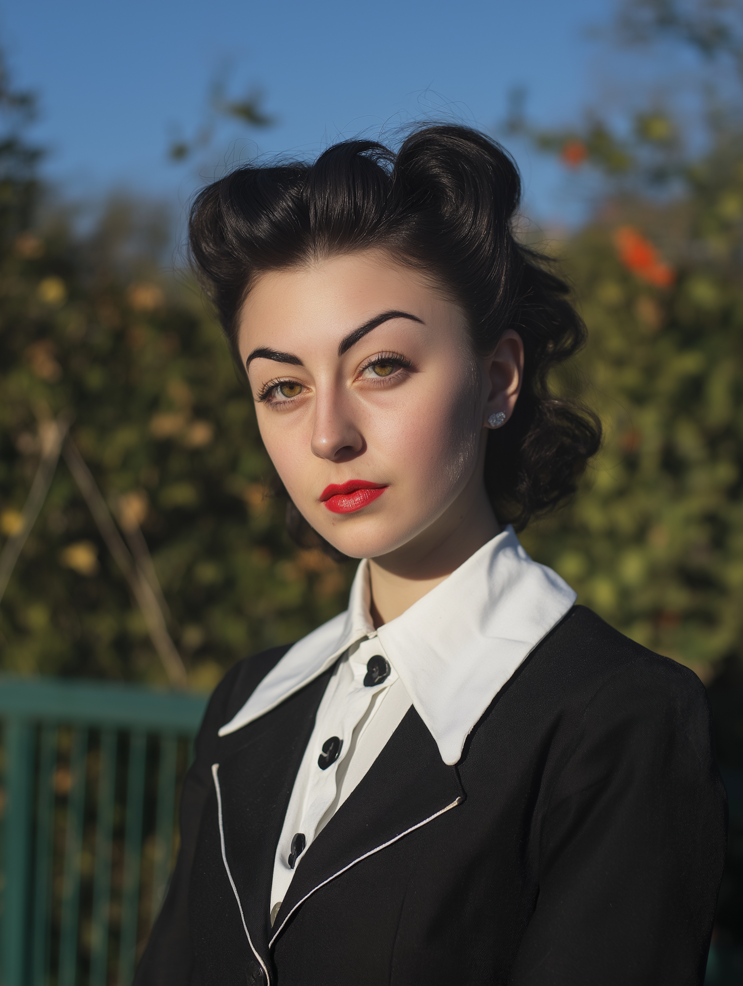 A woman in vintage attire with styled hair and bold makeup stands outdoors against a green and blue background.