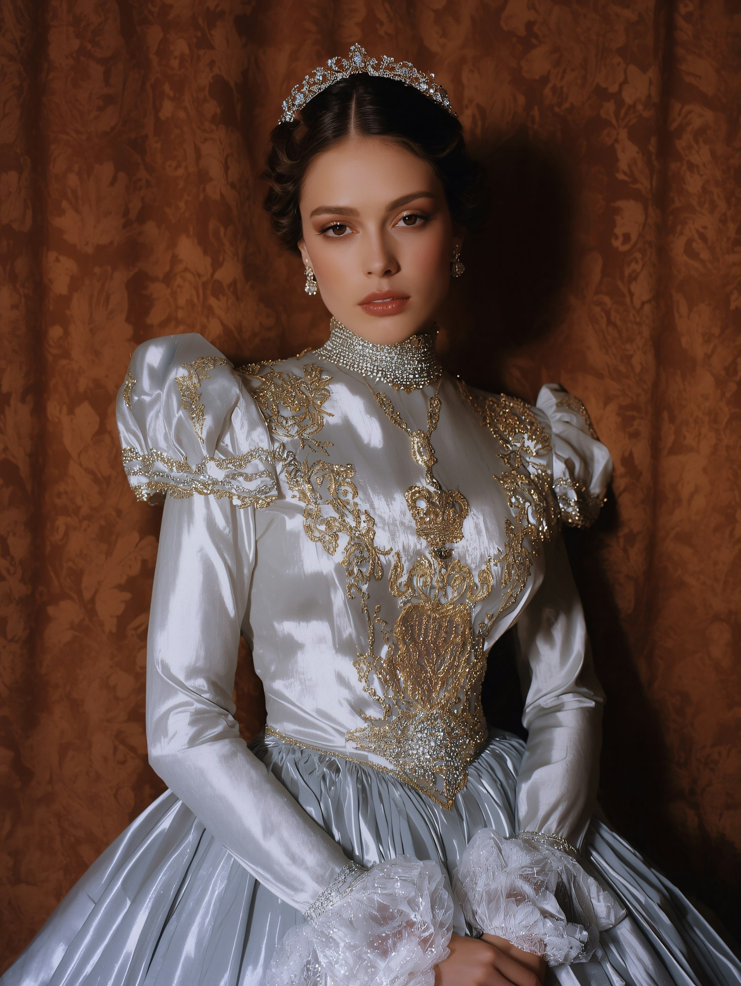 A woman in a regal silver gown with gold embroidery and a tiara poses against a textured brown backdrop, exuding elegance and grace.