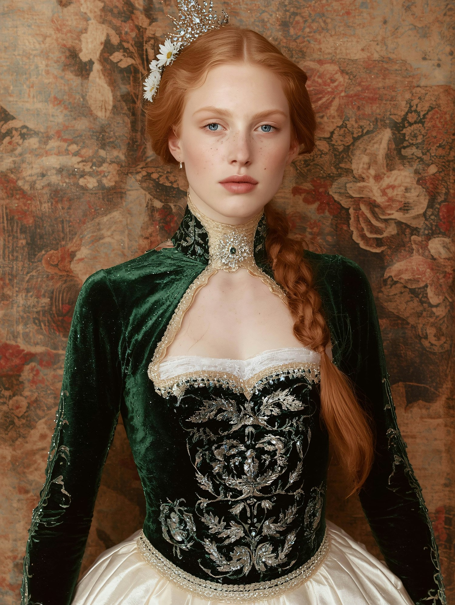 A young woman in a green velvet gown with silver embroidery and a tiara poses against a floral tapestry, exuding vintage elegance.