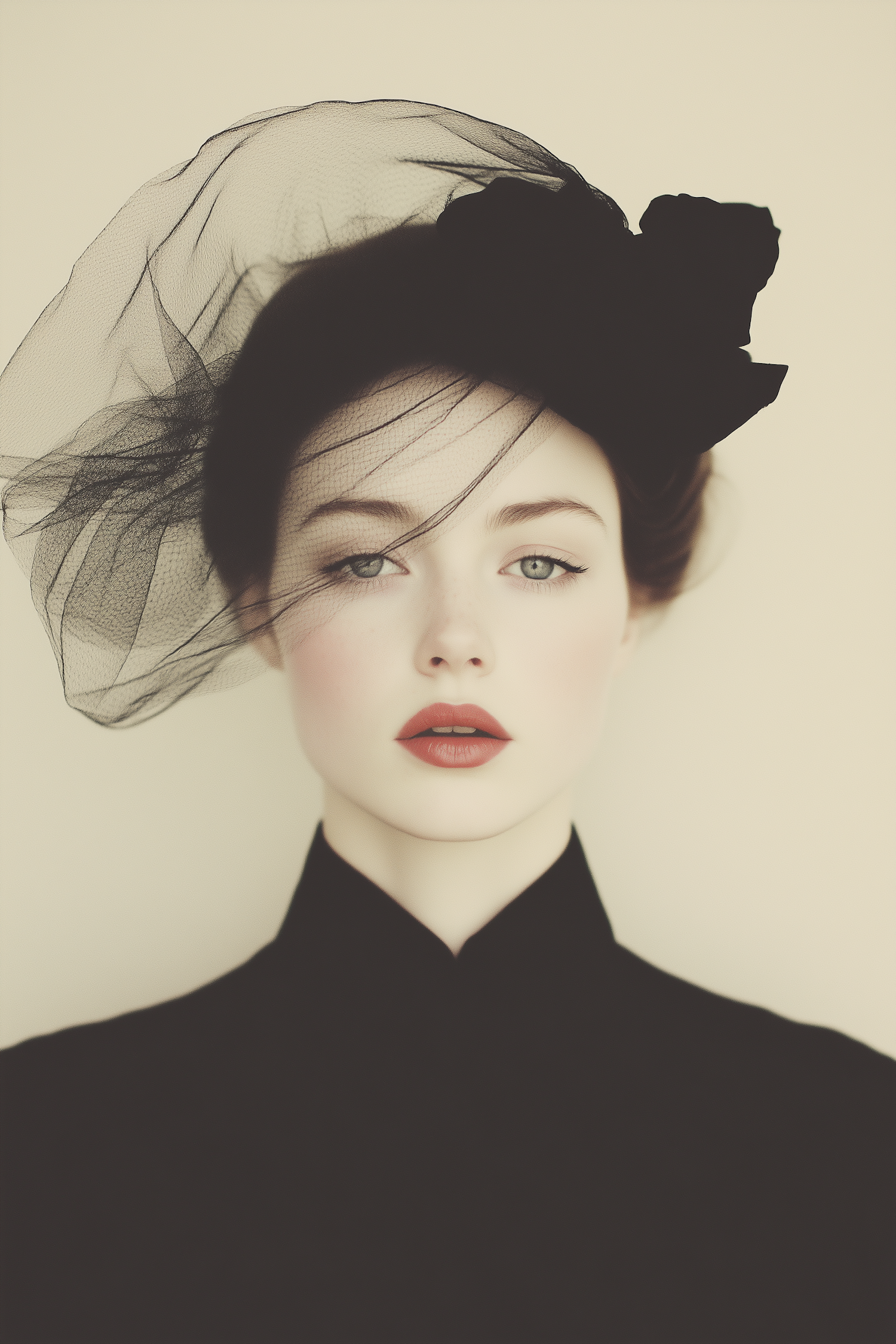 Elegant portrait of a woman in a black fascinator with veil, bold red lips, and a vintage-inspired look against a soft beige background.