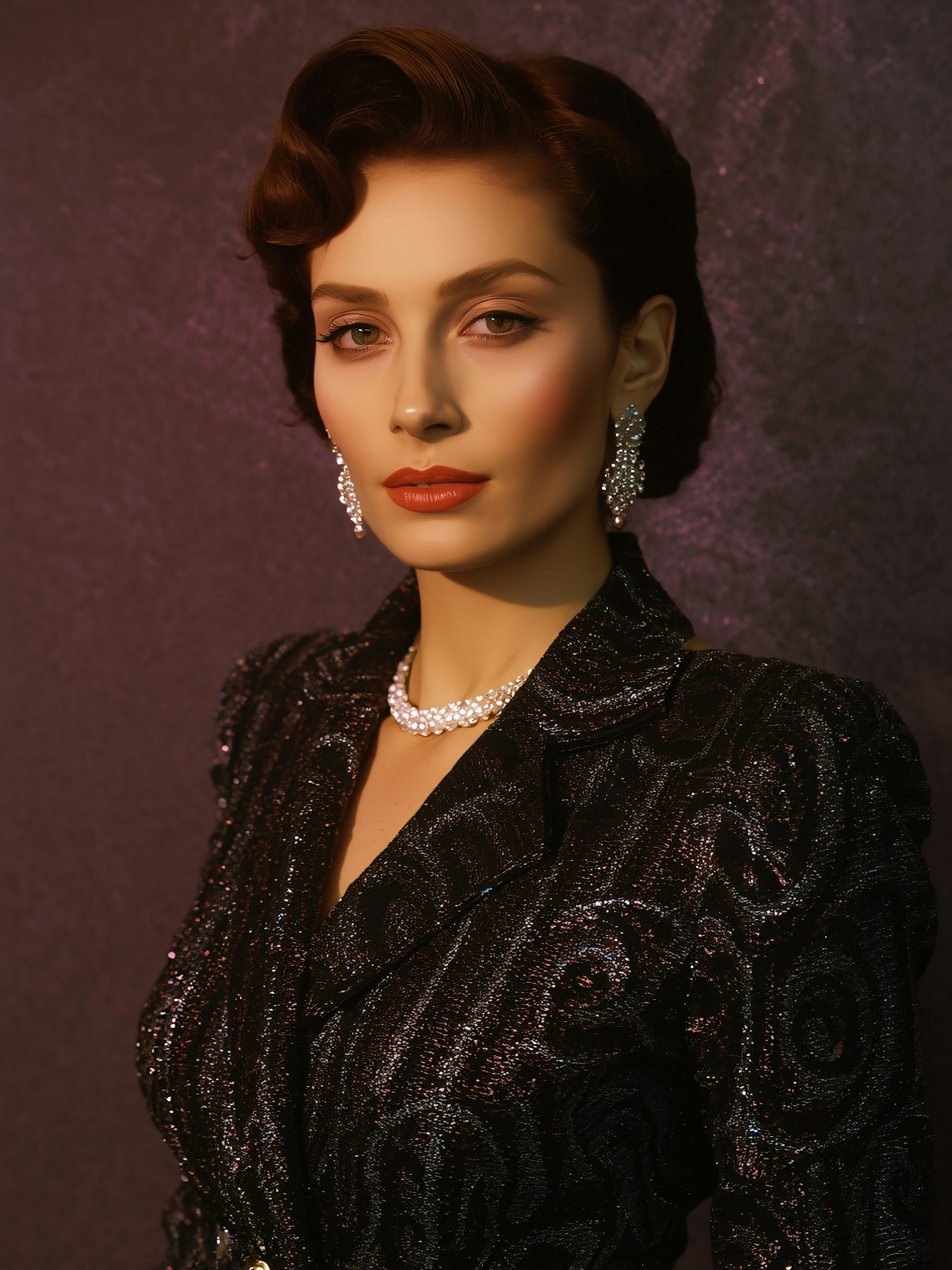 A poised woman in a shimmering black jacket and pearl jewelry, styled with vintage elegance against a textured dark background.