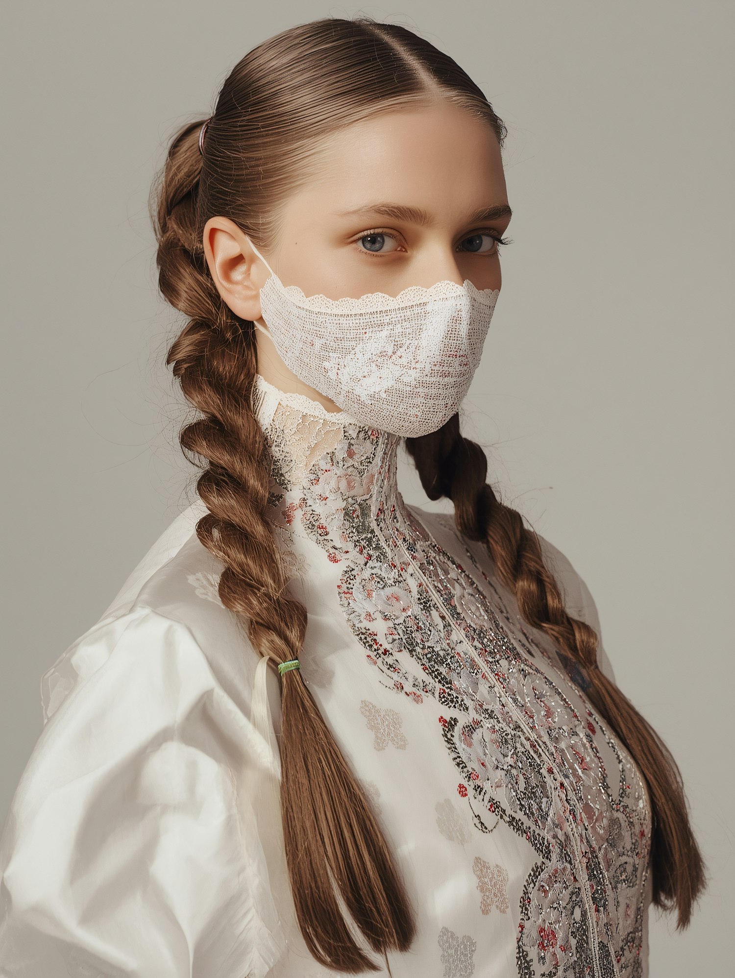 A woman with braided hair wears a lace mask and an embroidered blouse, showcasing a blend of vintage and modern fashion.