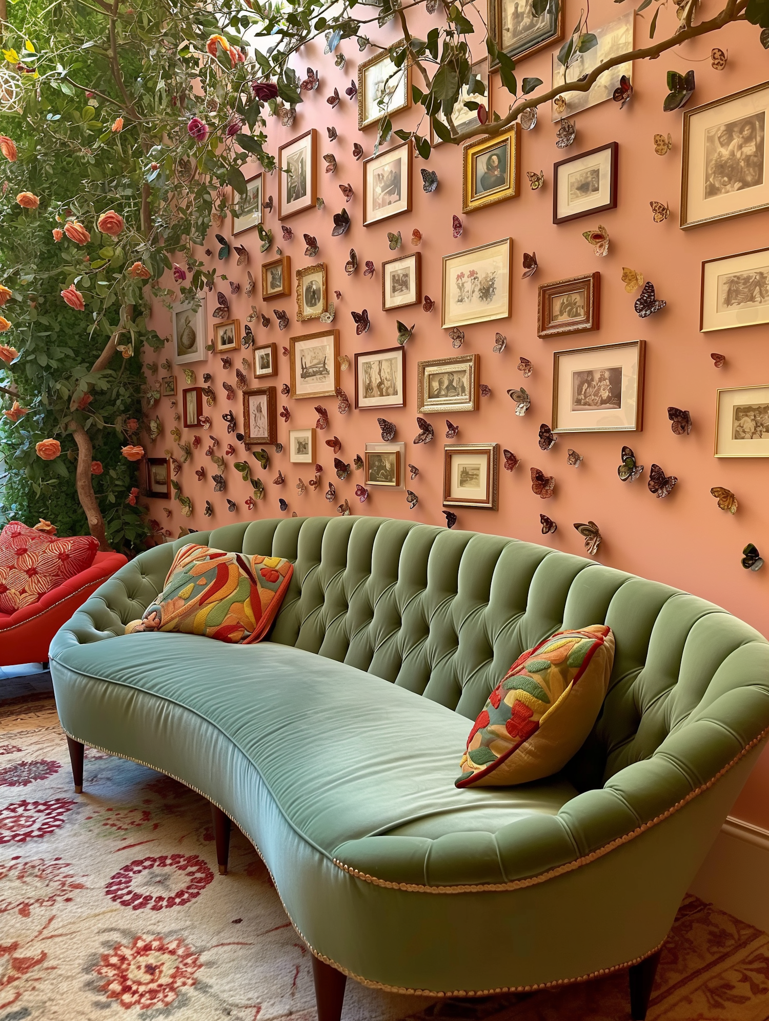 Charming living room with a green tufted sofa, pink wall adorned with art and butterflies, and vibrant floral decor.
