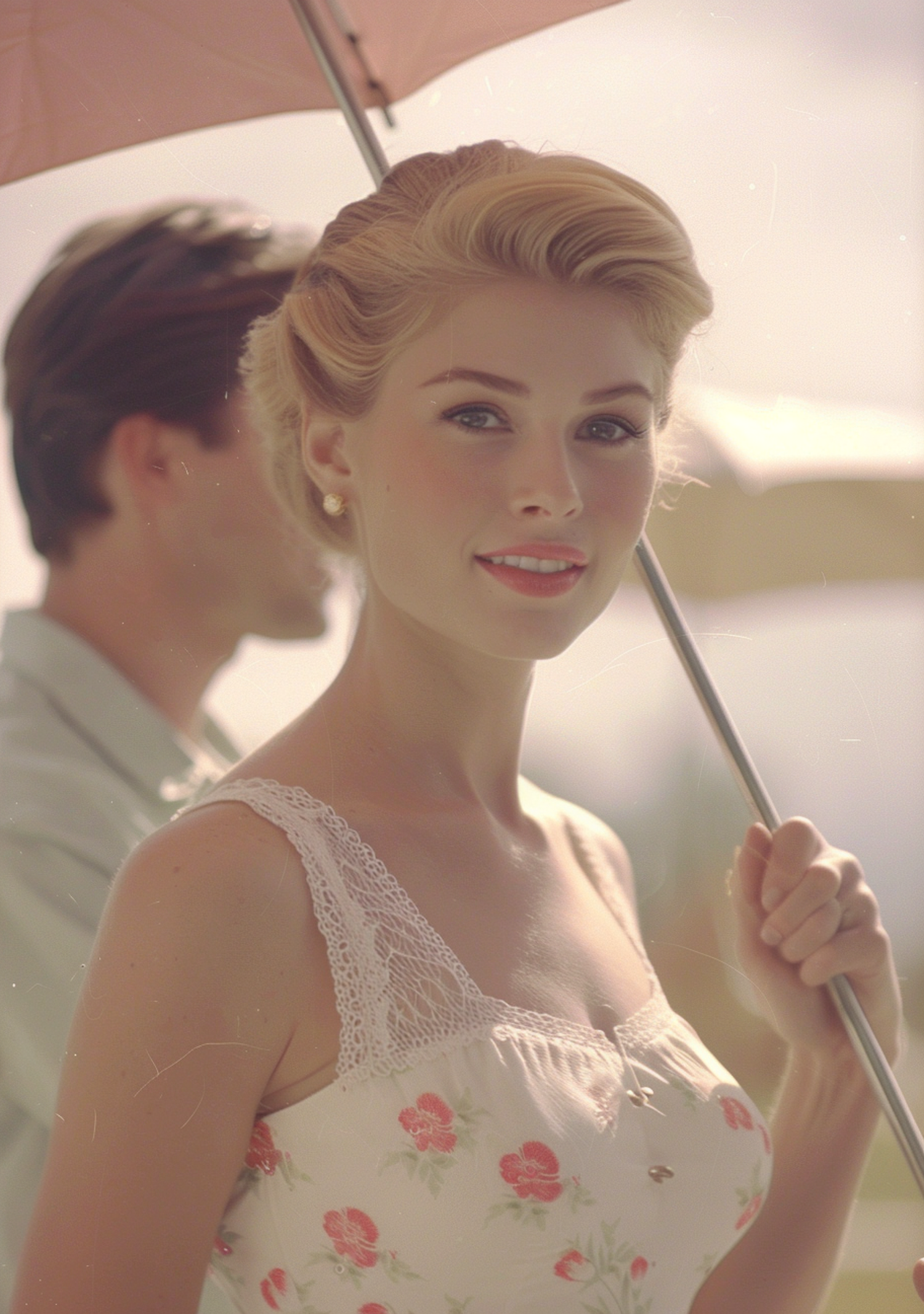 Vintage-style portrait of a blonde woman with a pink umbrella, wearing a floral dress, exuding elegance and charm.