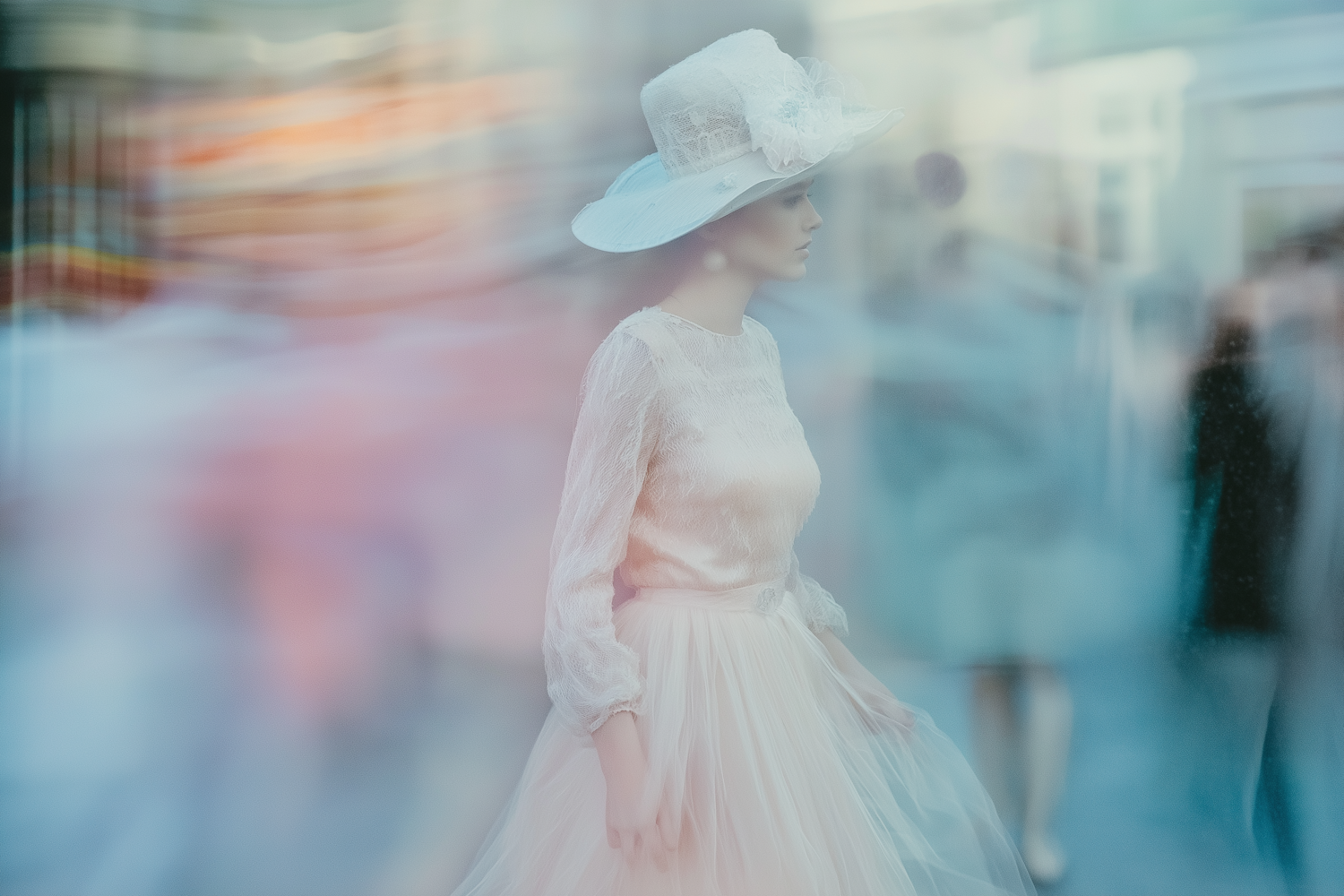 Elegant woman in vintage white lace outfit and hat walking through a dreamy, pastel-colored urban scene with blurred figures.