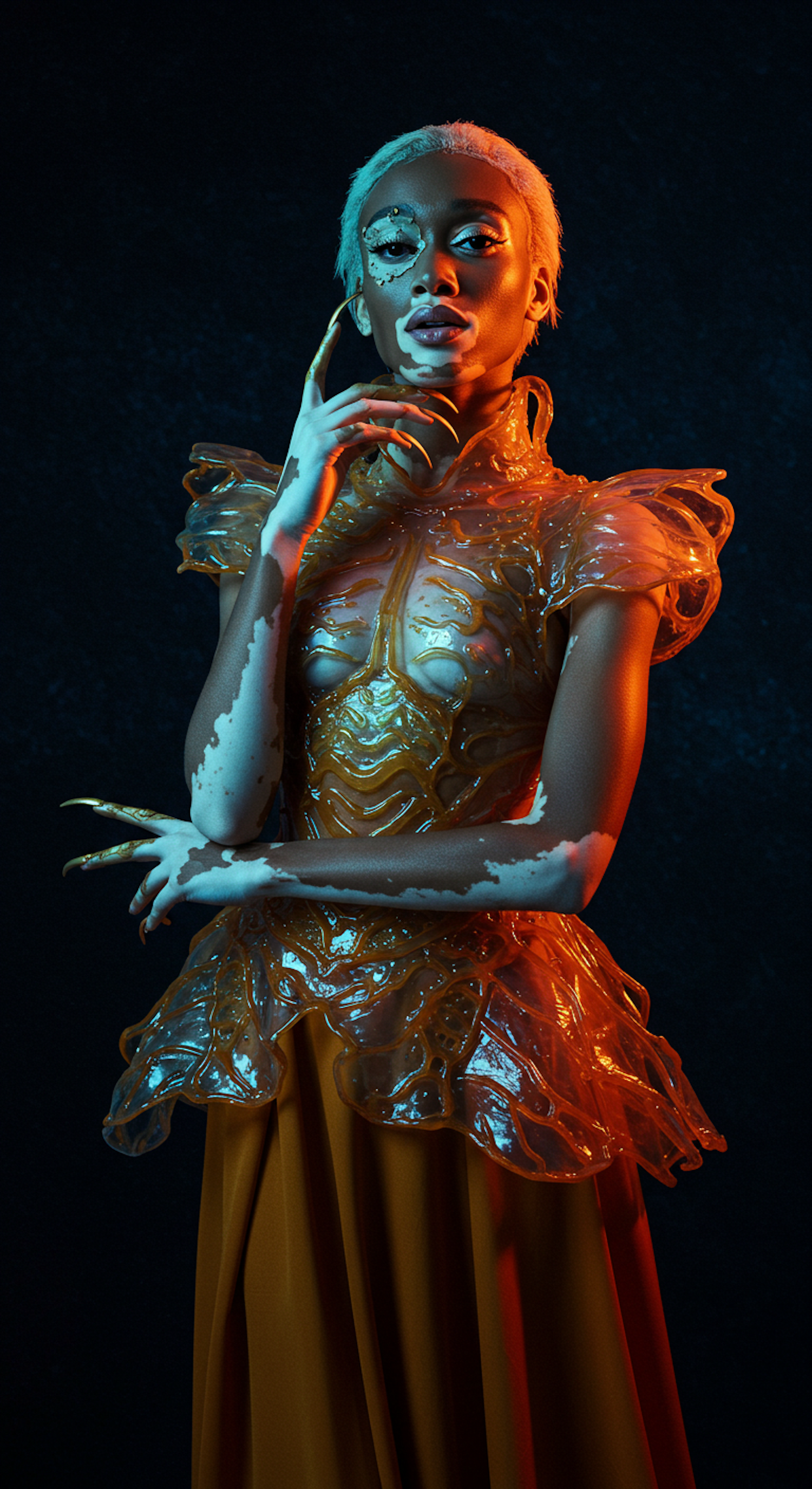A stunning portrait of a woman with vitiligo in a sculptural amber top and mustard skirt, set against a dramatic dark background.