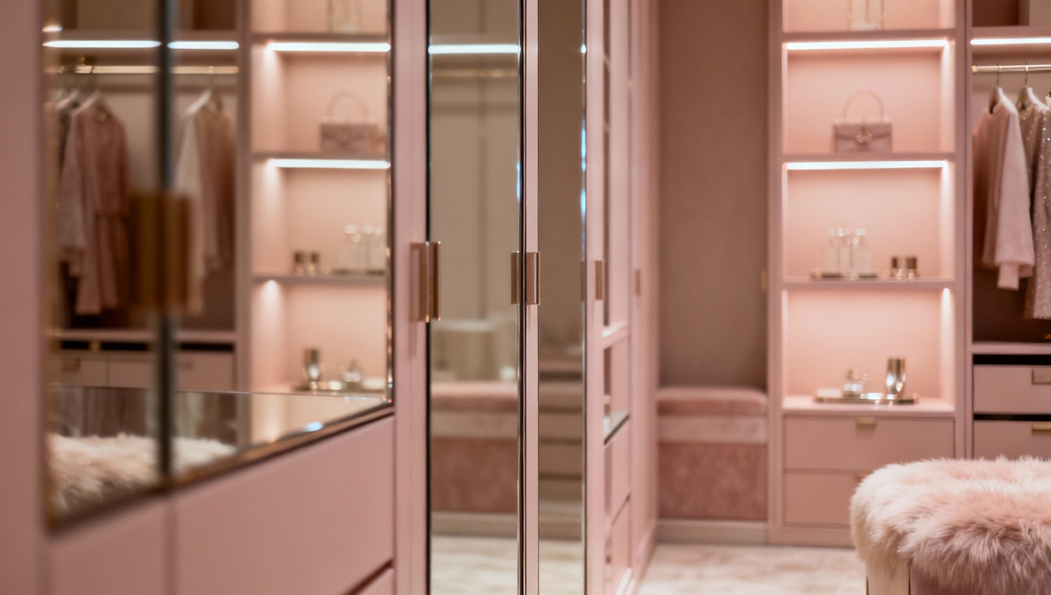 A chic walk-in closet with pink tones, mirrored doors, and elegant lighting, featuring handbags, perfumes, and a plush fur-covered stool.