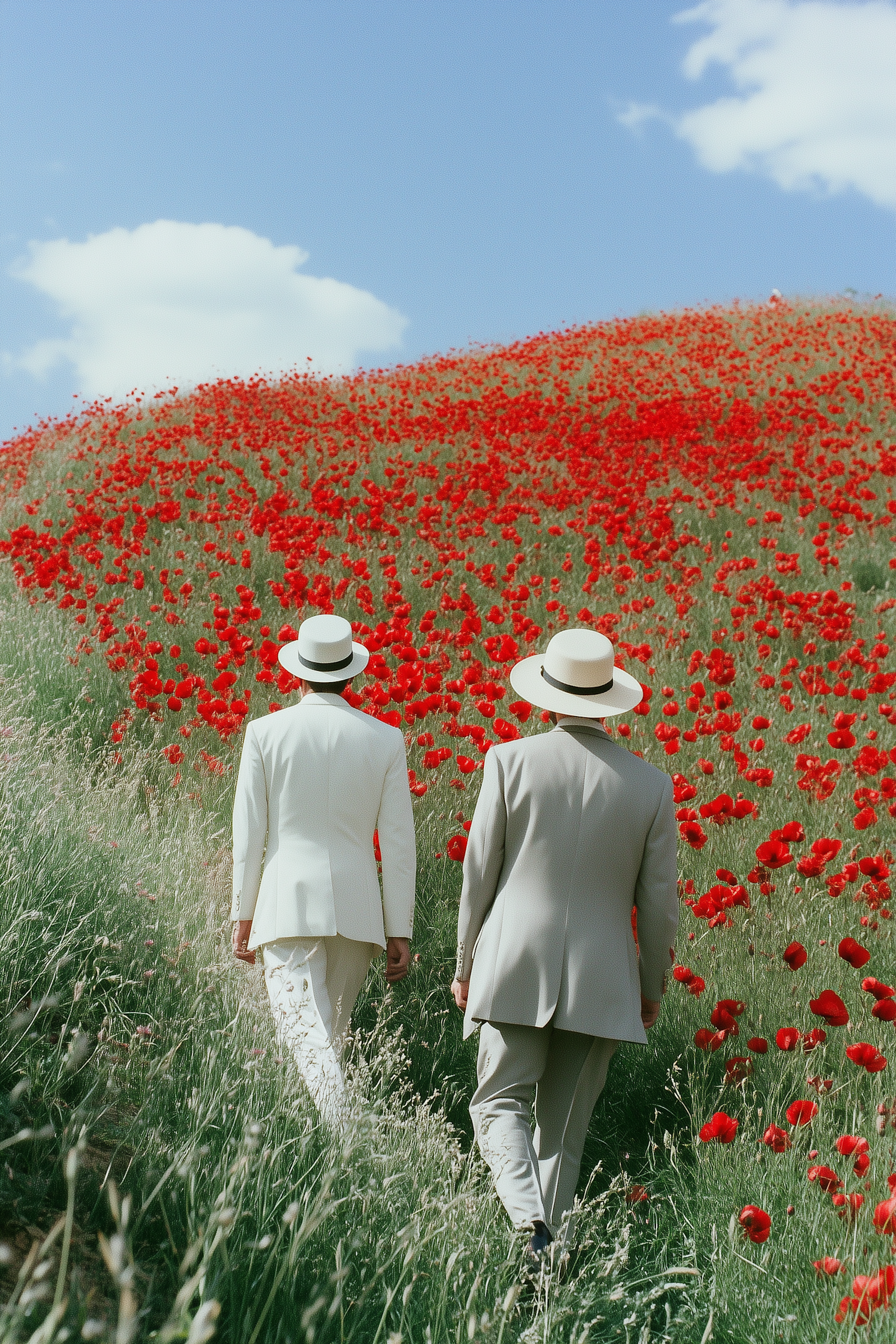 Two men in light suits walk through a vibrant poppy field under a clear blue sky, creating a serene and picturesque scene.
