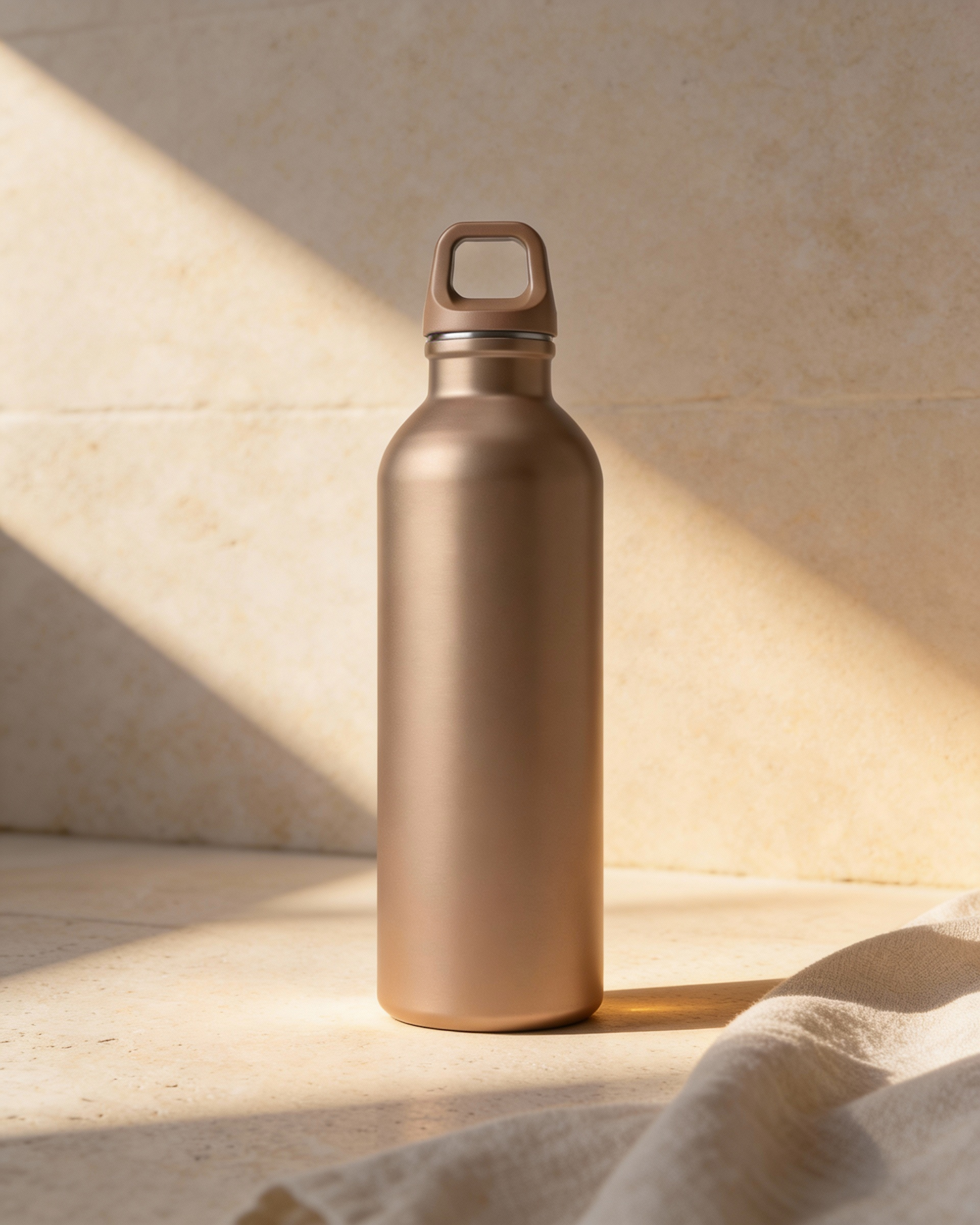 A stylish metallic water bottle on a stone surface, bathed in sunlight with soft shadows and a neutral background.