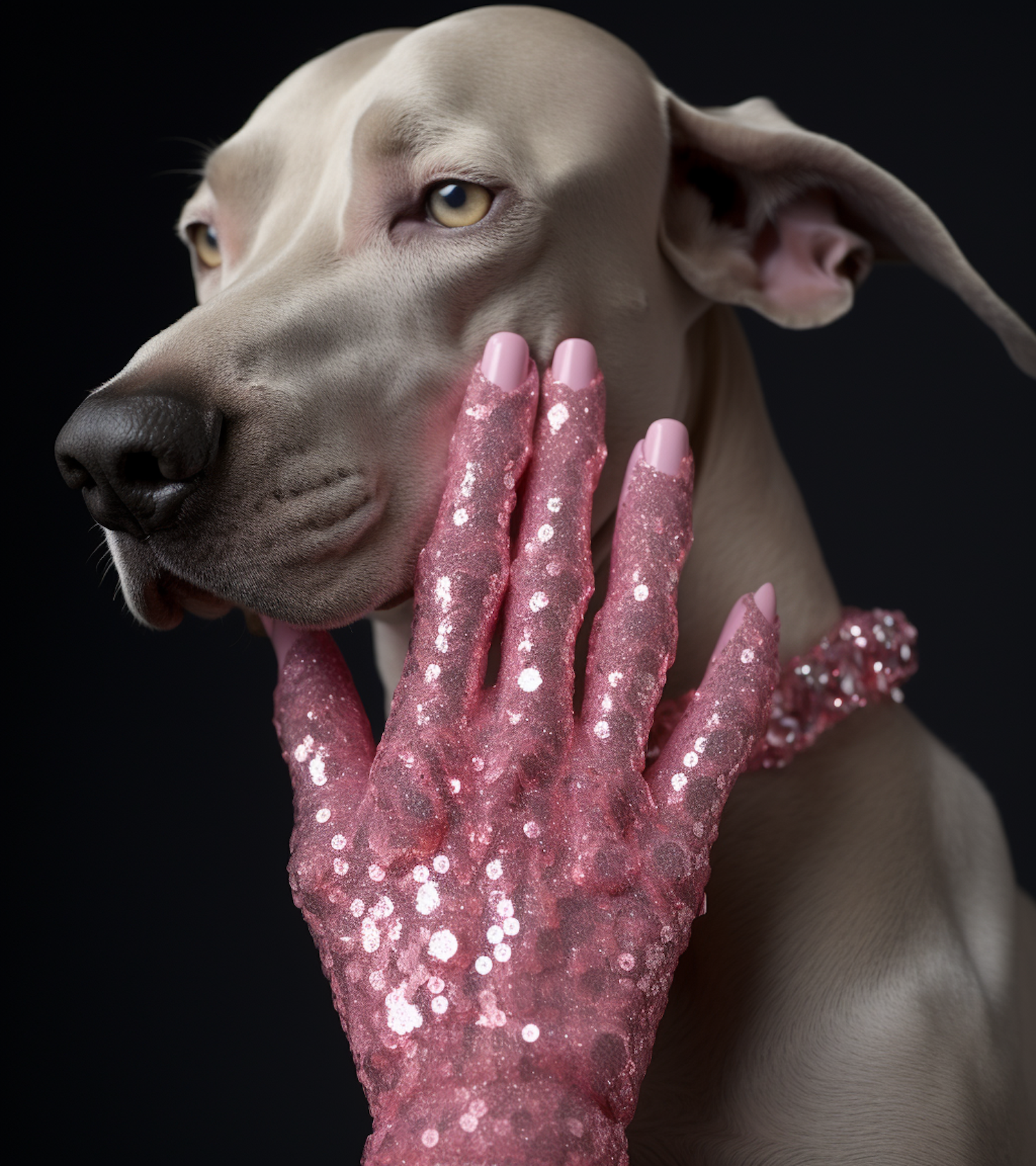 A sleek dog with yellow eyes is gently touched by a pink sequined hand, creating a striking contrast against a dark background.