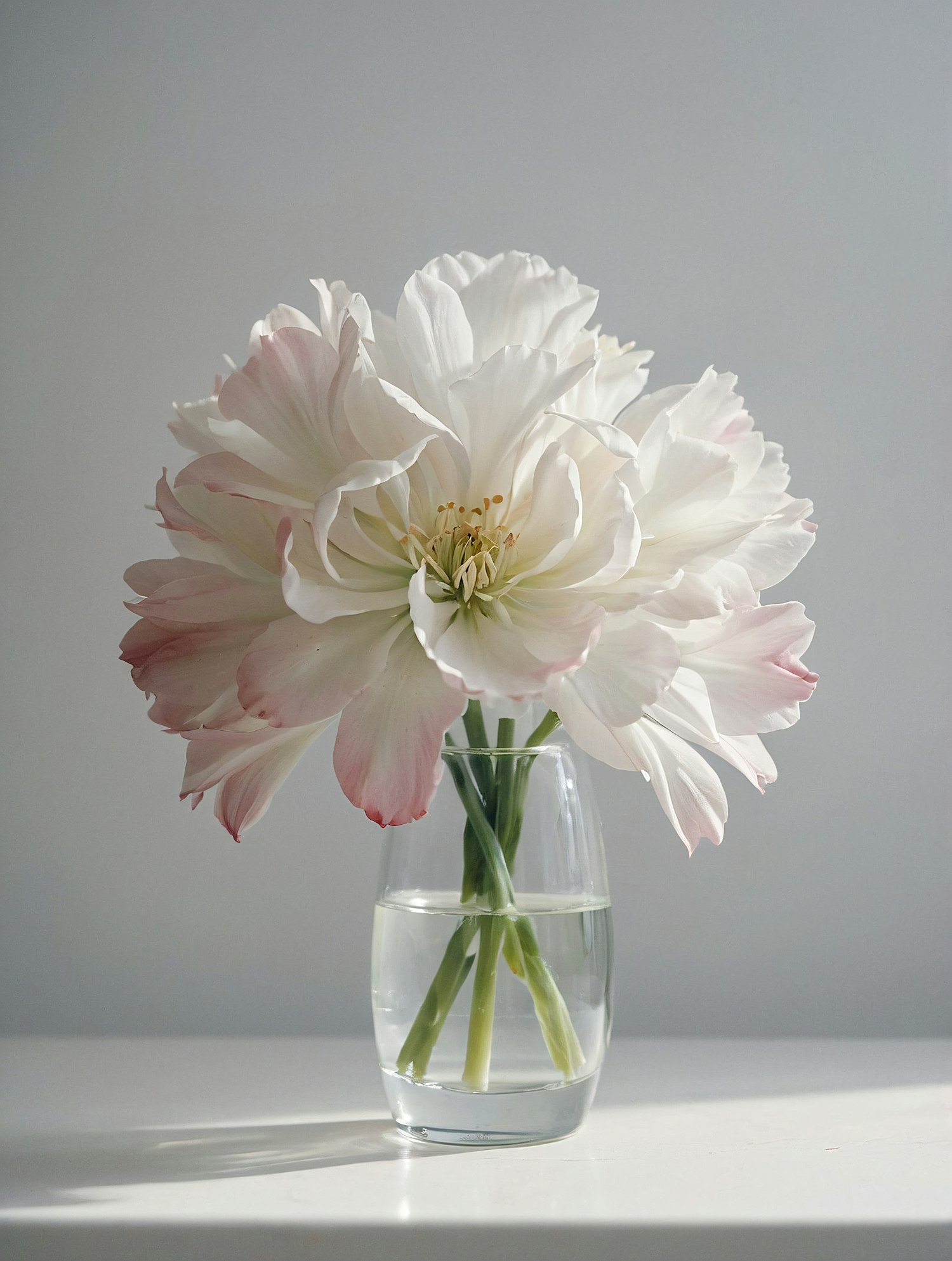Elegant white flowers with pink tips in a clear vase on a white surface, set against a light gray background.