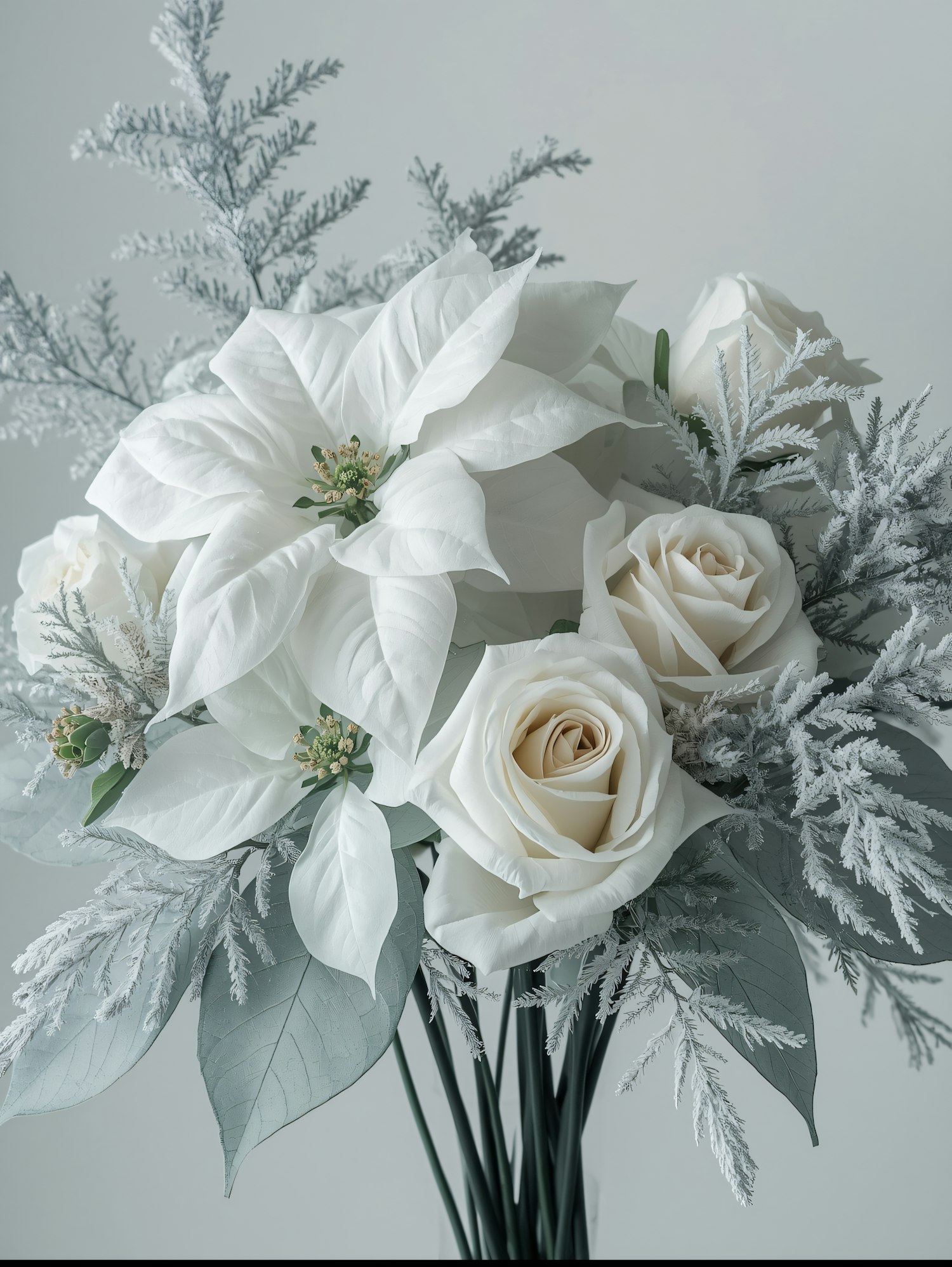 Elegant white roses and poinsettias with frosted greenery create a serene and sophisticated floral arrangement.
