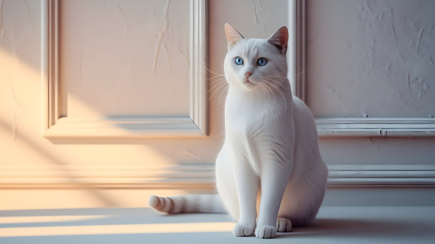 Elegant white cat with piercing blue eyes sits gracefully in soft sunlight against a textured wall with decorative molding.