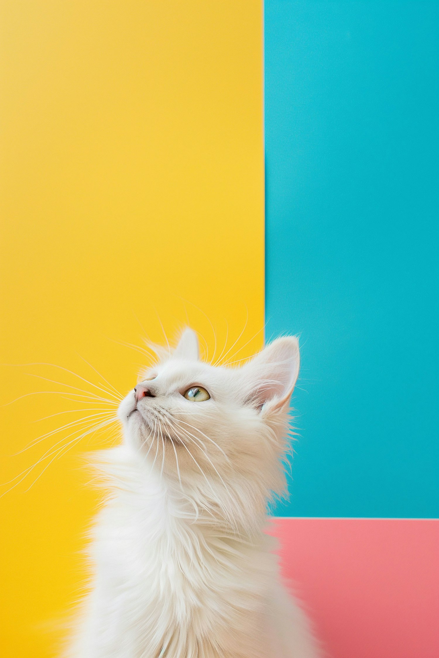 Fluffy white cat with green eyes against a vibrant yellow, blue, and pink background. Playful and colorful composition.