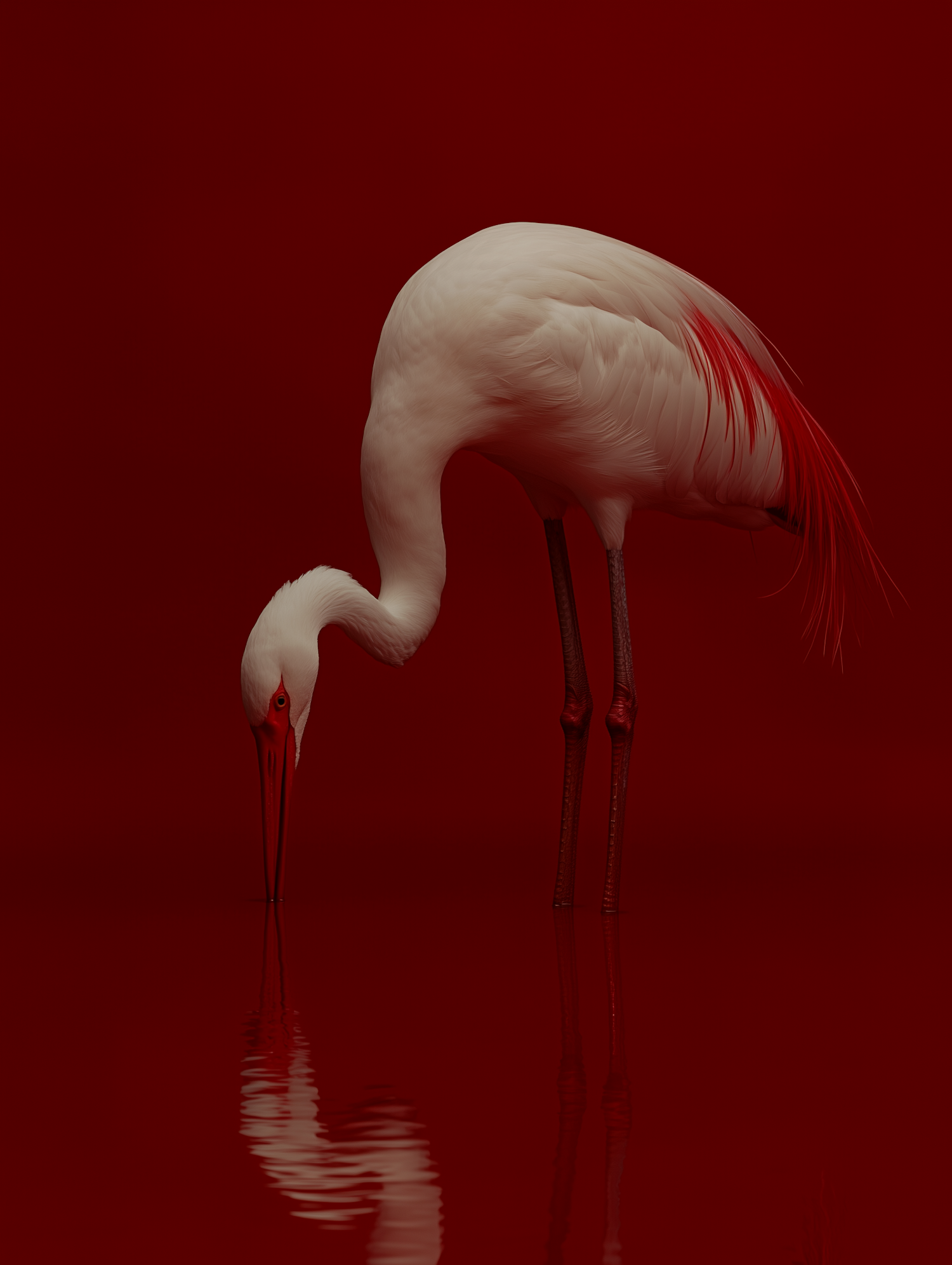 Elegant white crane with red-tipped wings against a deep red background, reflecting in water. Striking contrast and serene composition.