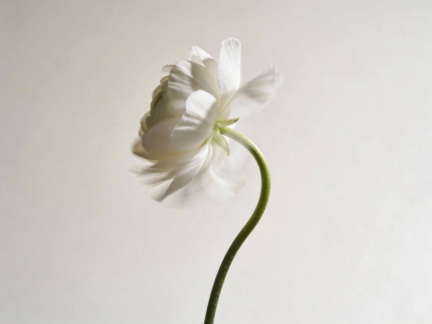 A minimalist, poetic fine art photograph of a single white flower with delicate, soft petals, photographed against a very light off-white background. The flower is seen from the side, positioned slightly off-center, with a thin, gently curved green stem. The petals appear partially blurred, as if moved by a light breeze, creating a subtle motion blur and an airy, flowing effect. Shallow depth of field, soft natural light, no harsh shadows, matte finish, very soft contrast. The overall atmosphere is calm, ethereal, and quiet, with a minimalist composition and a strong sense of lightness and fragility. High-end editorial photography, analog feel, understated and timeless.