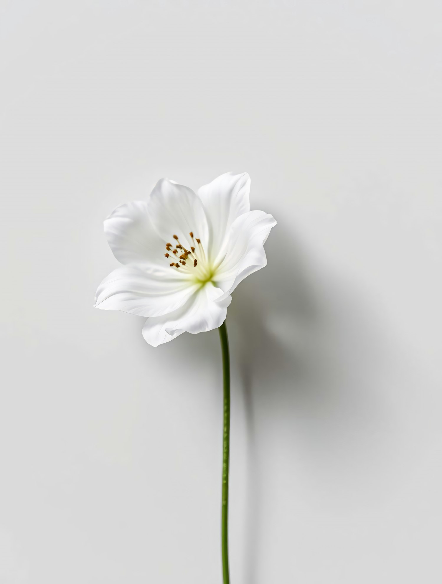 Minimalist white flower with soft petals and a long green stem on a light gray background, perfect for serene and elegant decor.