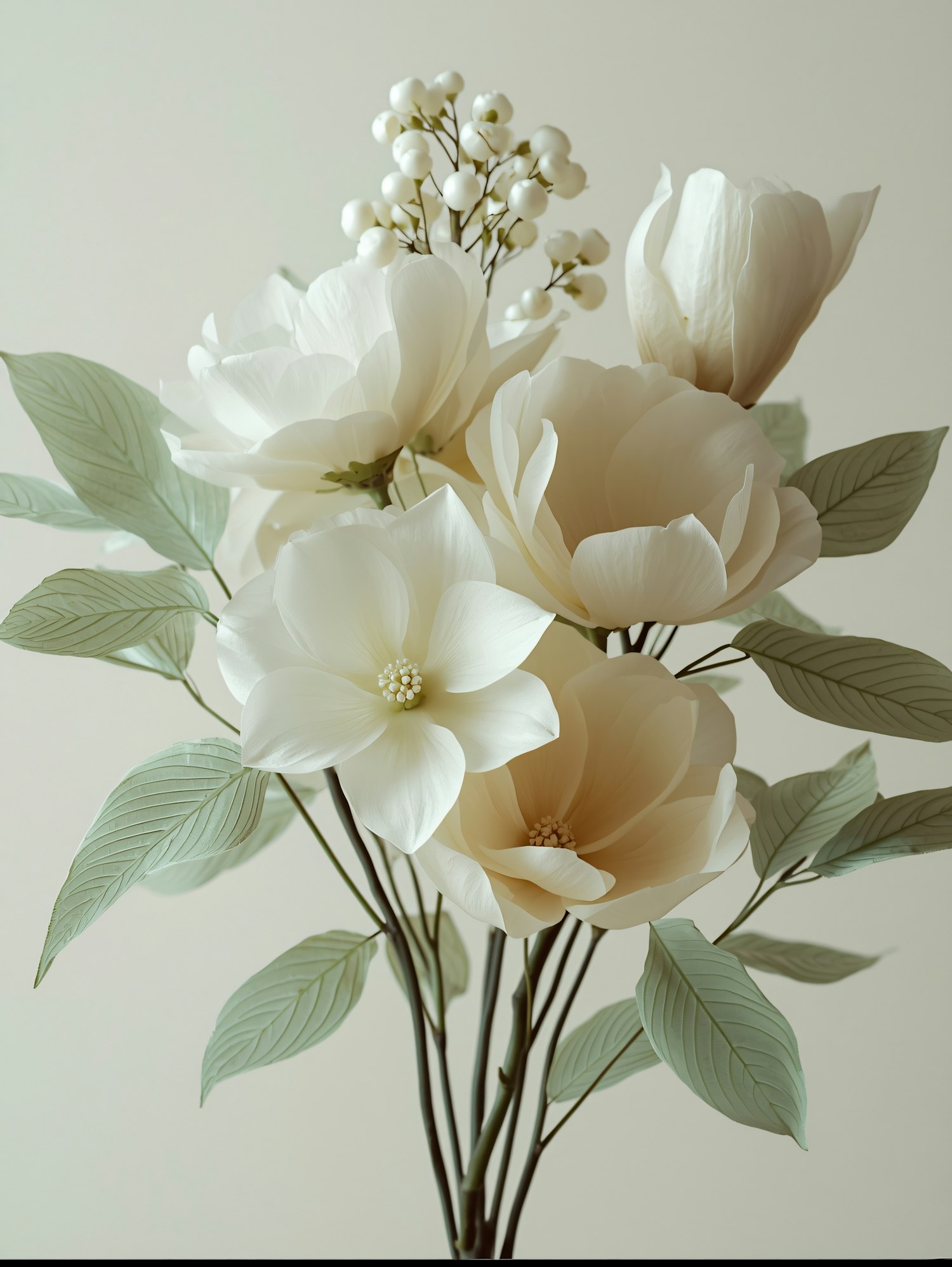 A serene arrangement of white flowers and green leaves, showcasing delicate textures and a minimalist aesthetic.
