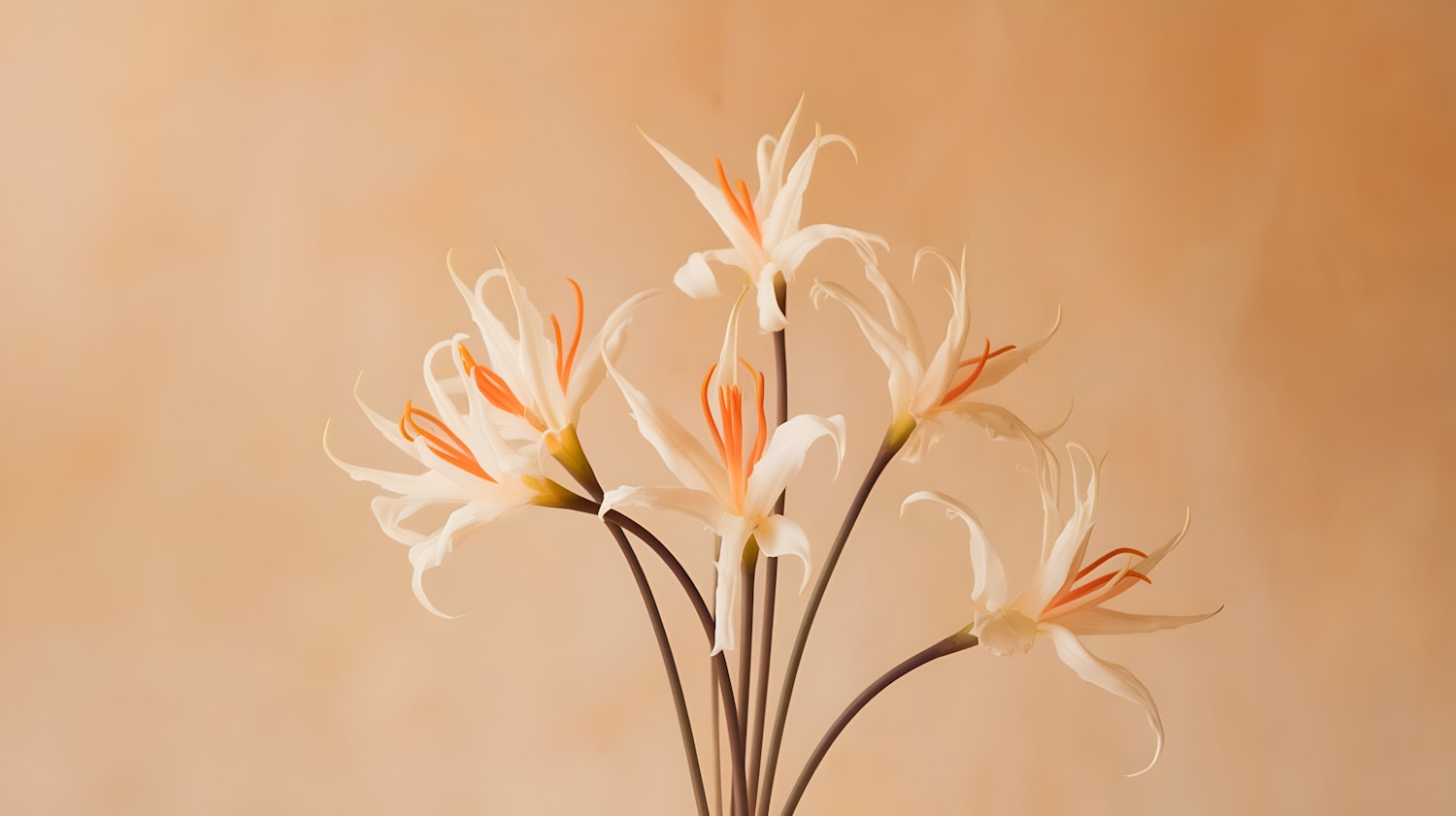 Elegant white flowers with orange stamens on dark stems, set against a soft beige background. Perfect for a minimalist floral vibe.