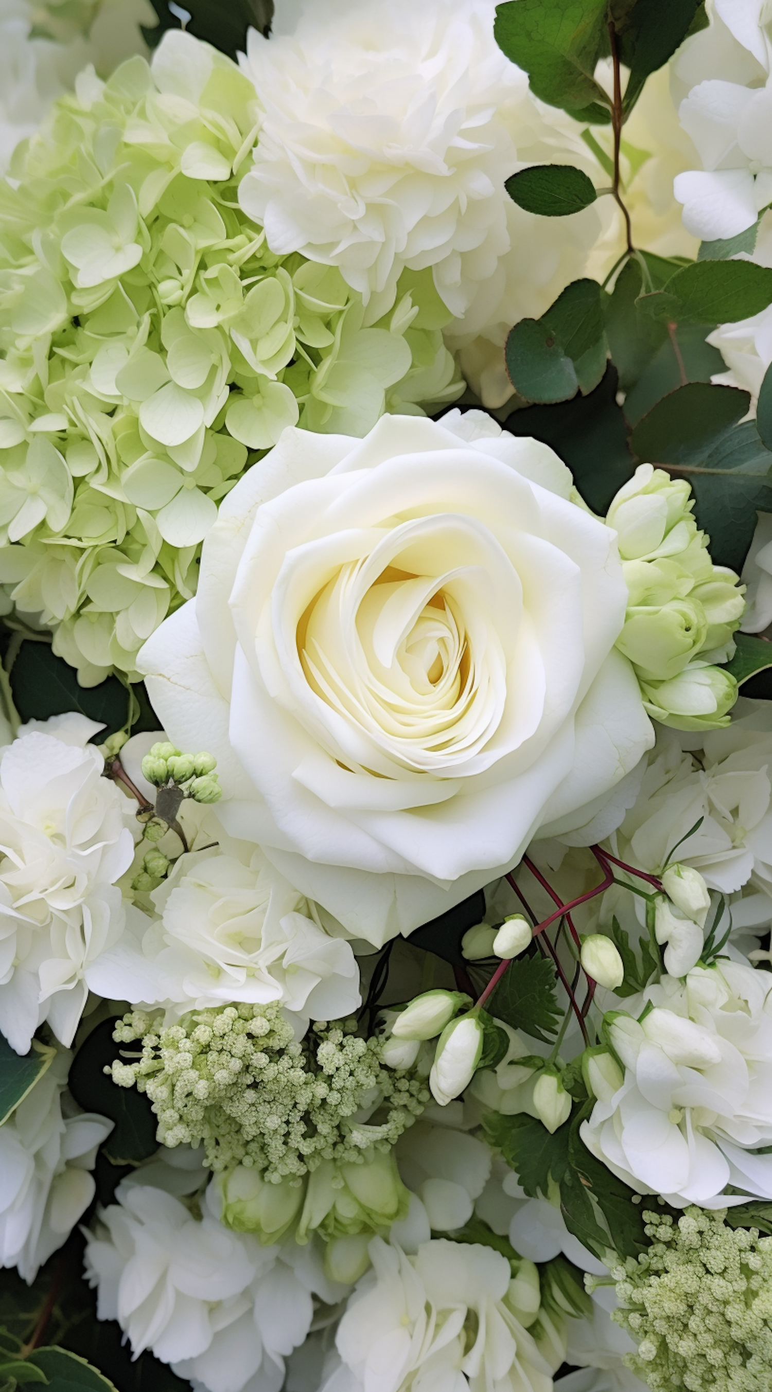 Elegant floral arrangement with white roses, pale green hydrangeas, and lush greenery, creating a serene and sophisticated display.