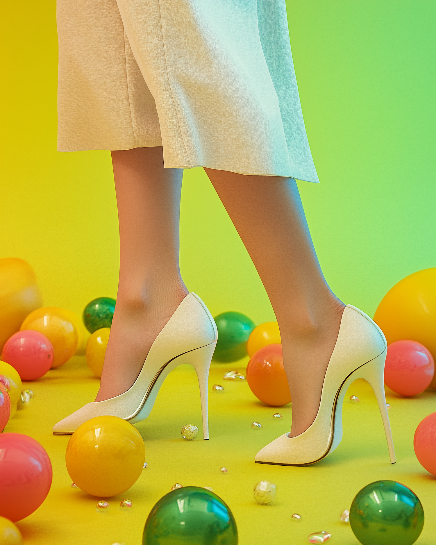 Elegant white high heels on a colorful background with vibrant spheres, creating a playful and stylish scene.