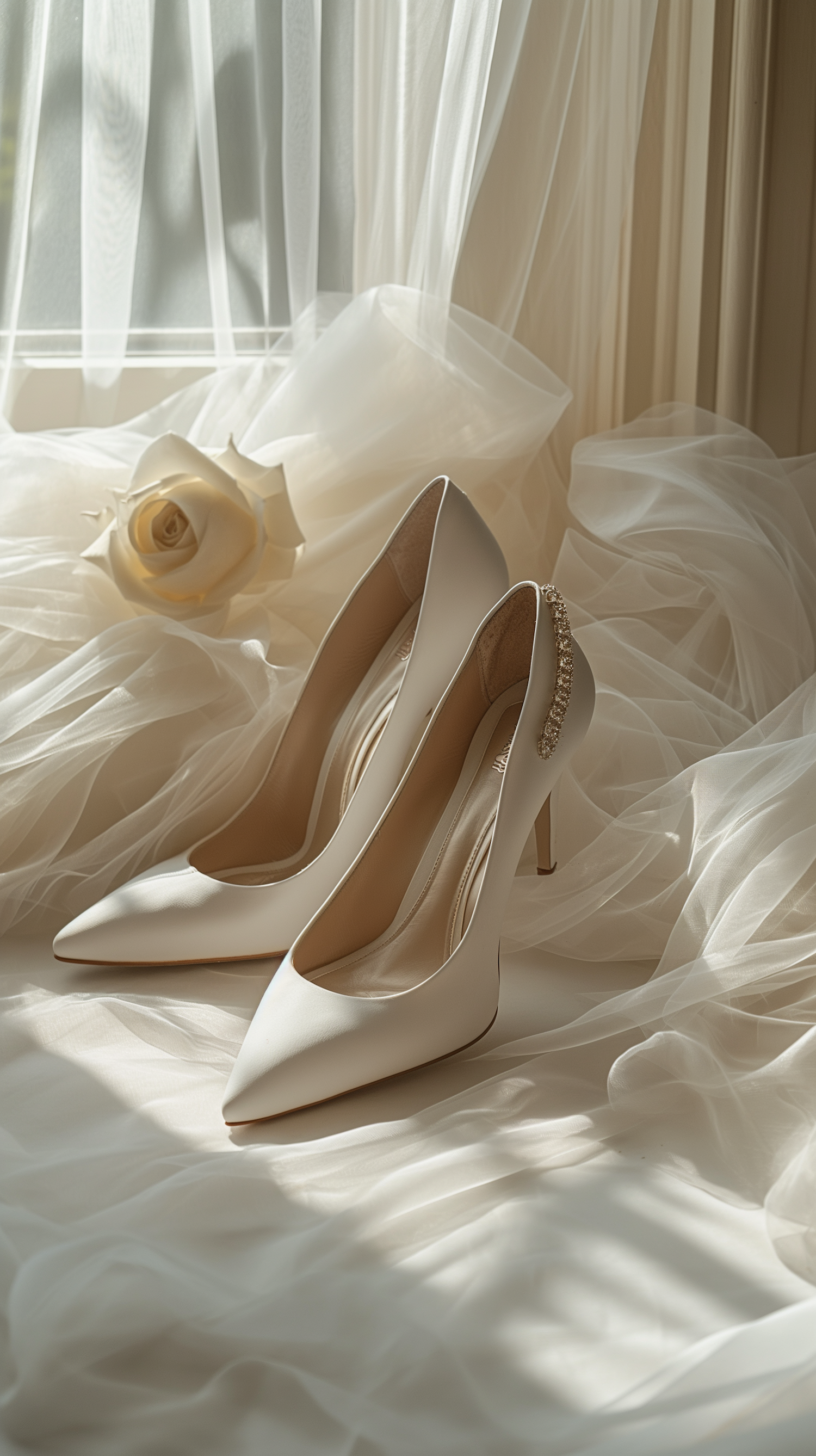 Elegant white high heels on soft fabric with a white rose, bathed in gentle sunlight, creating a serene and romantic atmosphere.