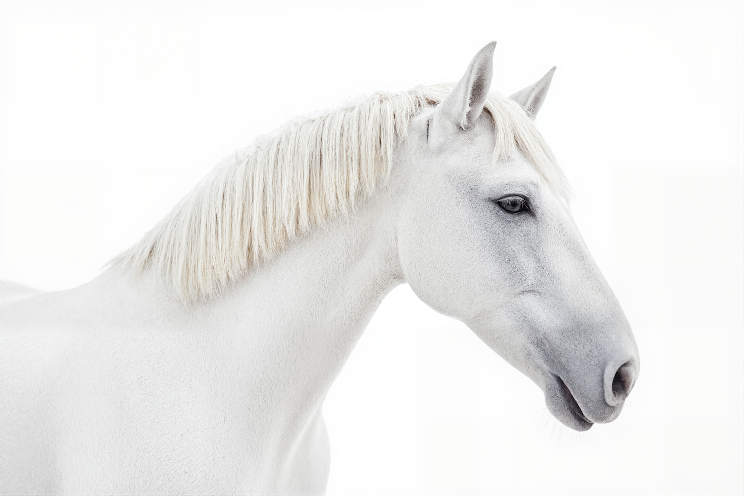 Elegant side profile of a white horse with a clean coat and trimmed mane against a minimalist white background.