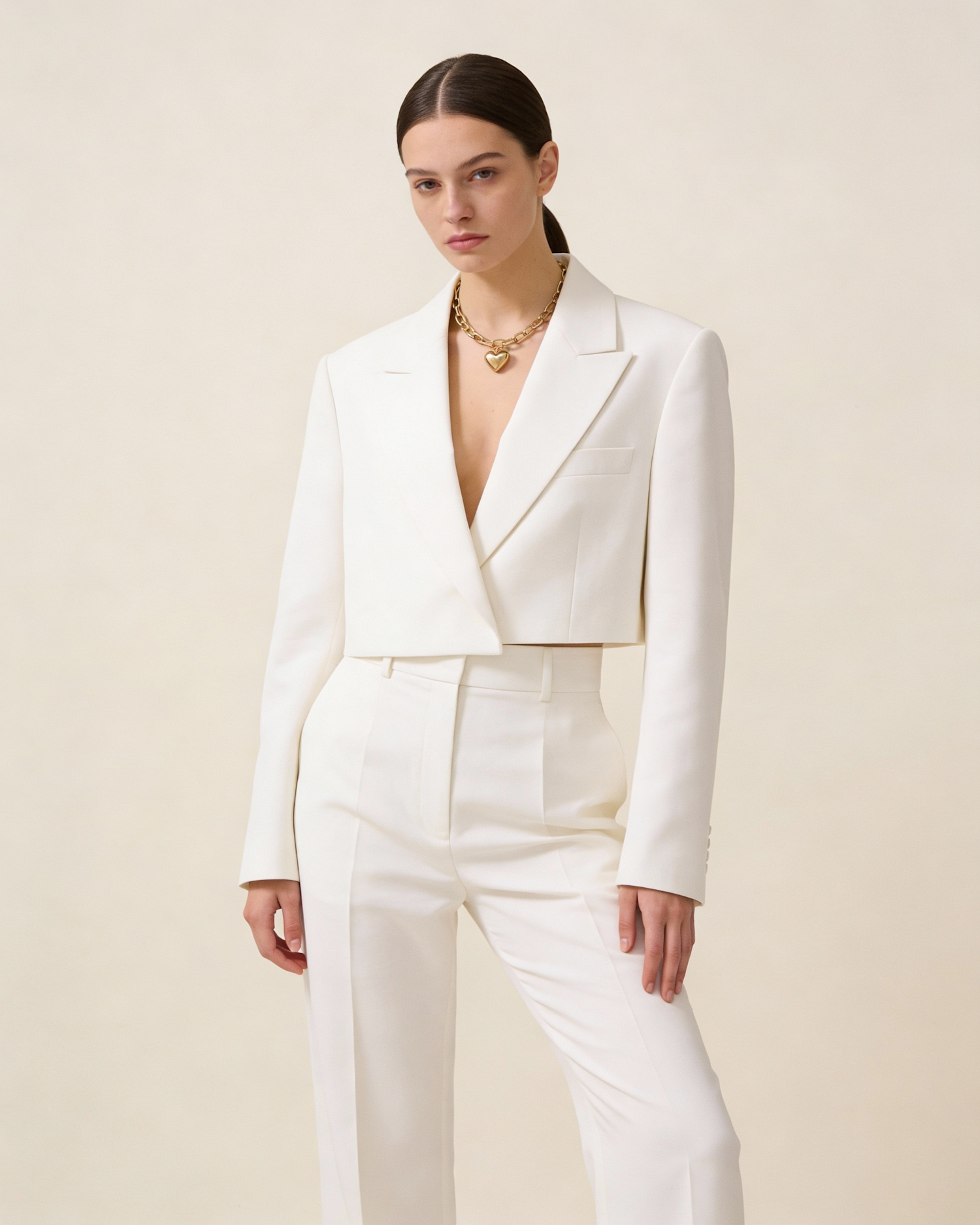 A woman in a white tailored suit with a gold necklace poses against a neutral background, showcasing minimalist elegance.