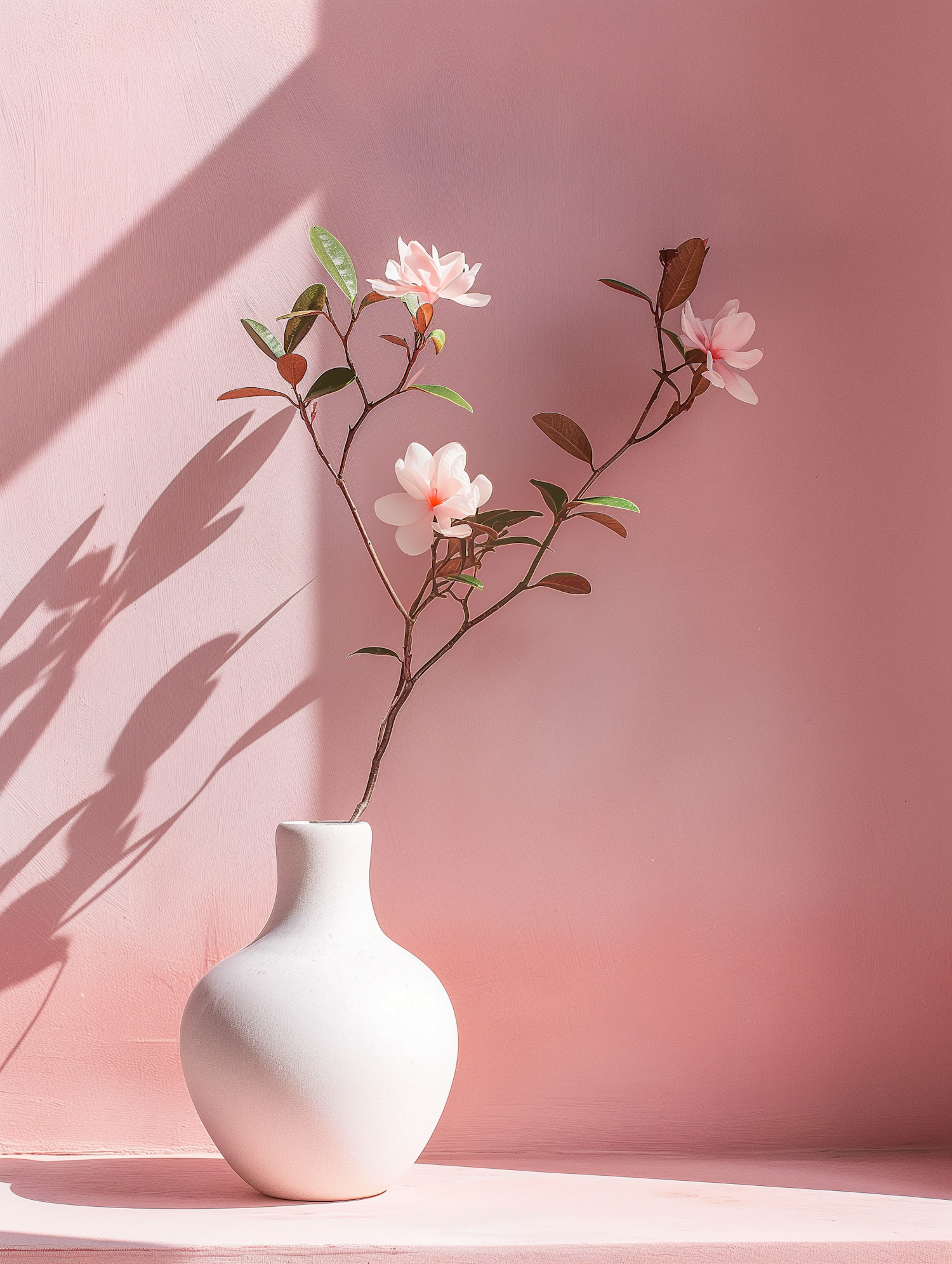 Minimalist white vase with pink flowers against a soft pink background, creating a serene and elegant composition.