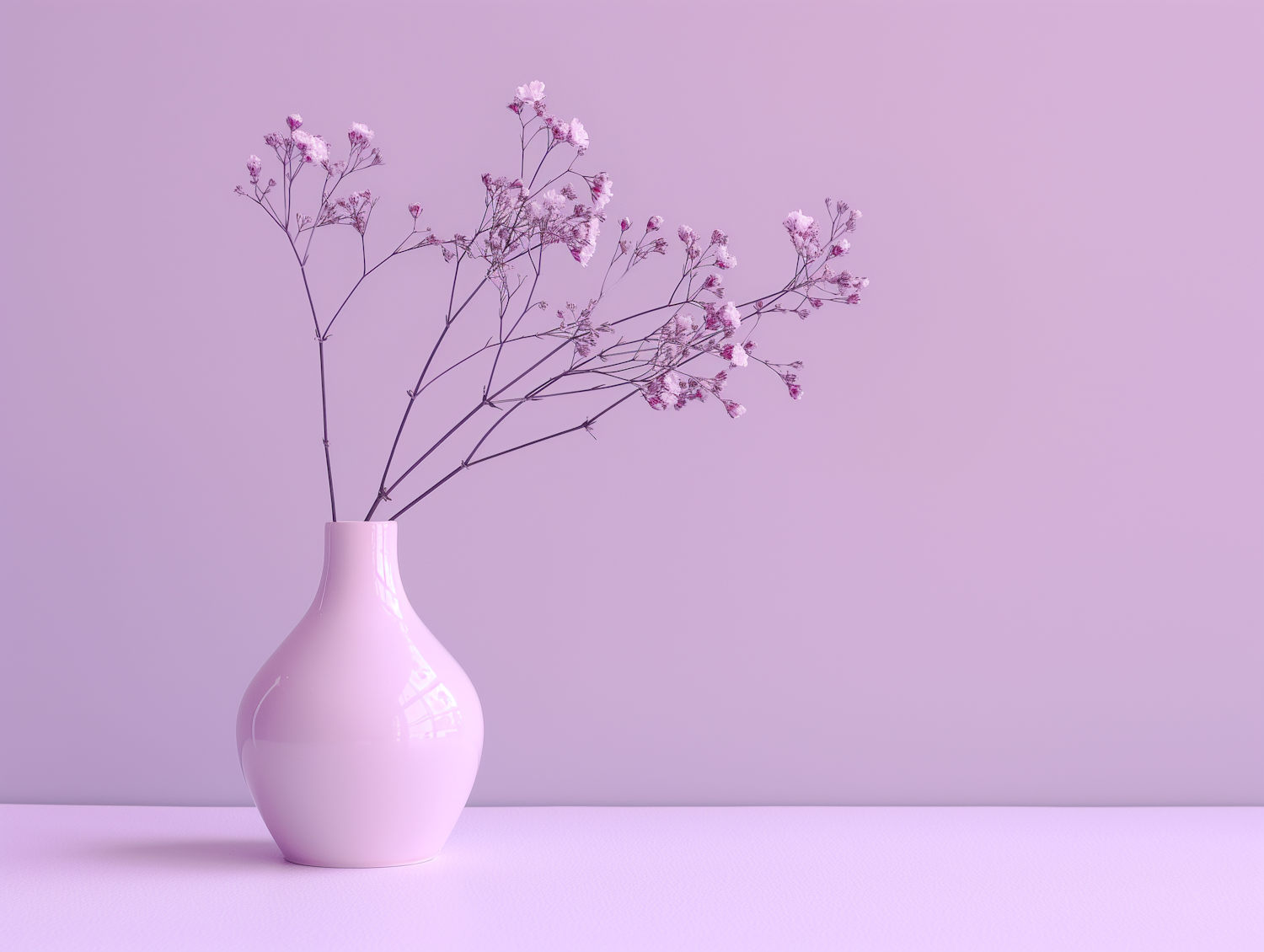 Minimalist pink vase with baby's breath flowers against a pastel pink background, creating a serene and monochromatic aesthetic.