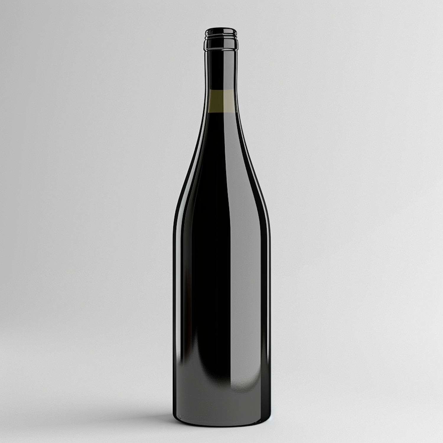 Elegant dark glass bottle with a sleek design, standing against a light gray background. Minimalist and label-free.