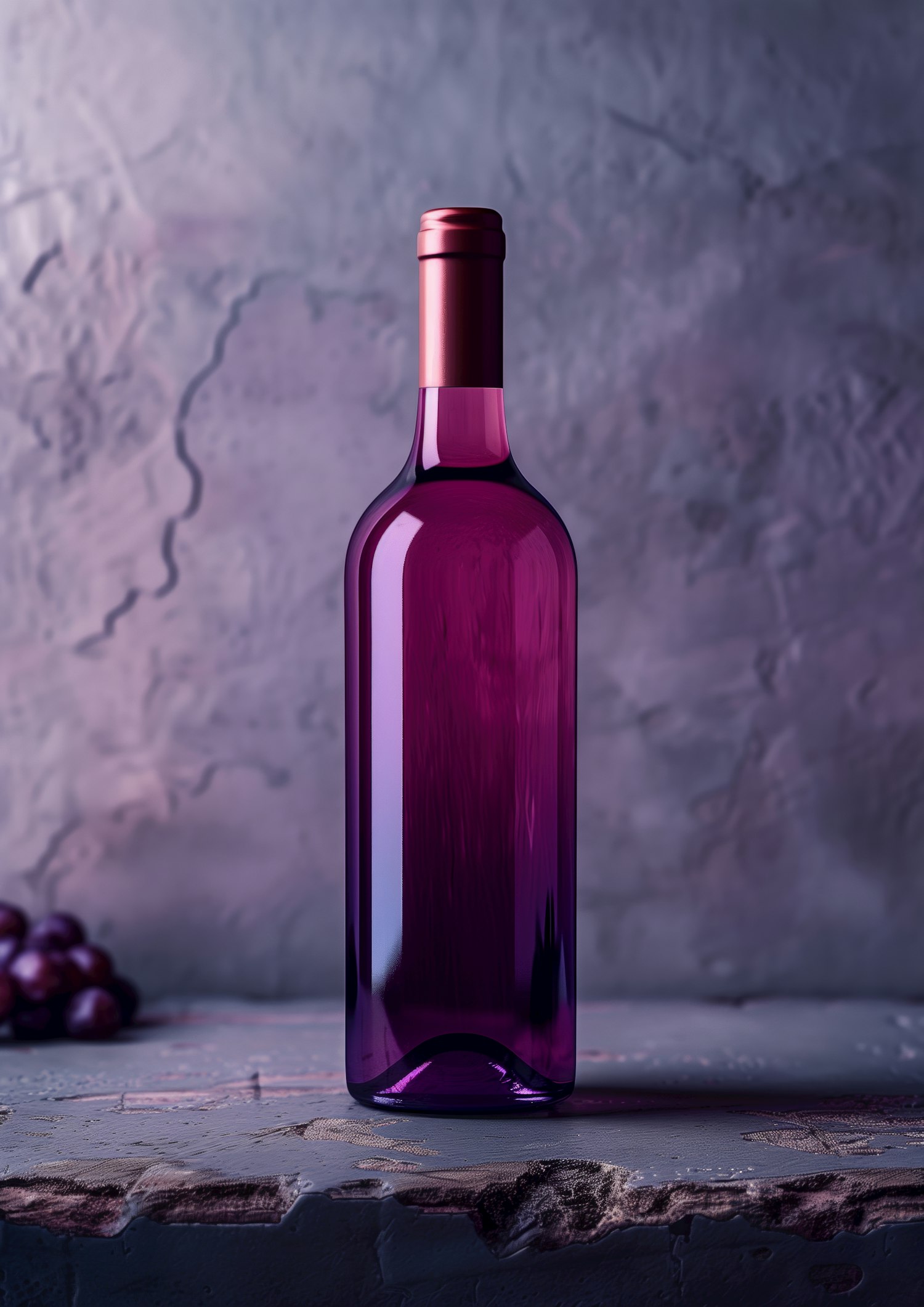 Elegant purple wine bottle with rose-gold cap on rustic surface, grapes in background, set against a textured gray backdrop.