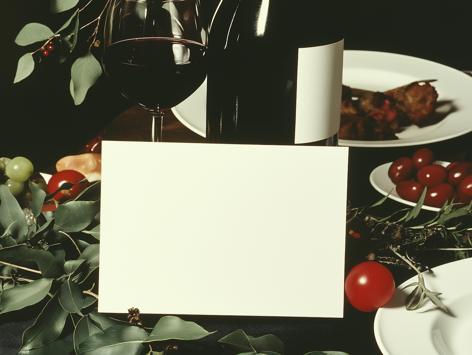 Elegant dining setup with wine, grapes, tomatoes, and a blank card for a personalized touch. Perfect for gourmet meal settings.