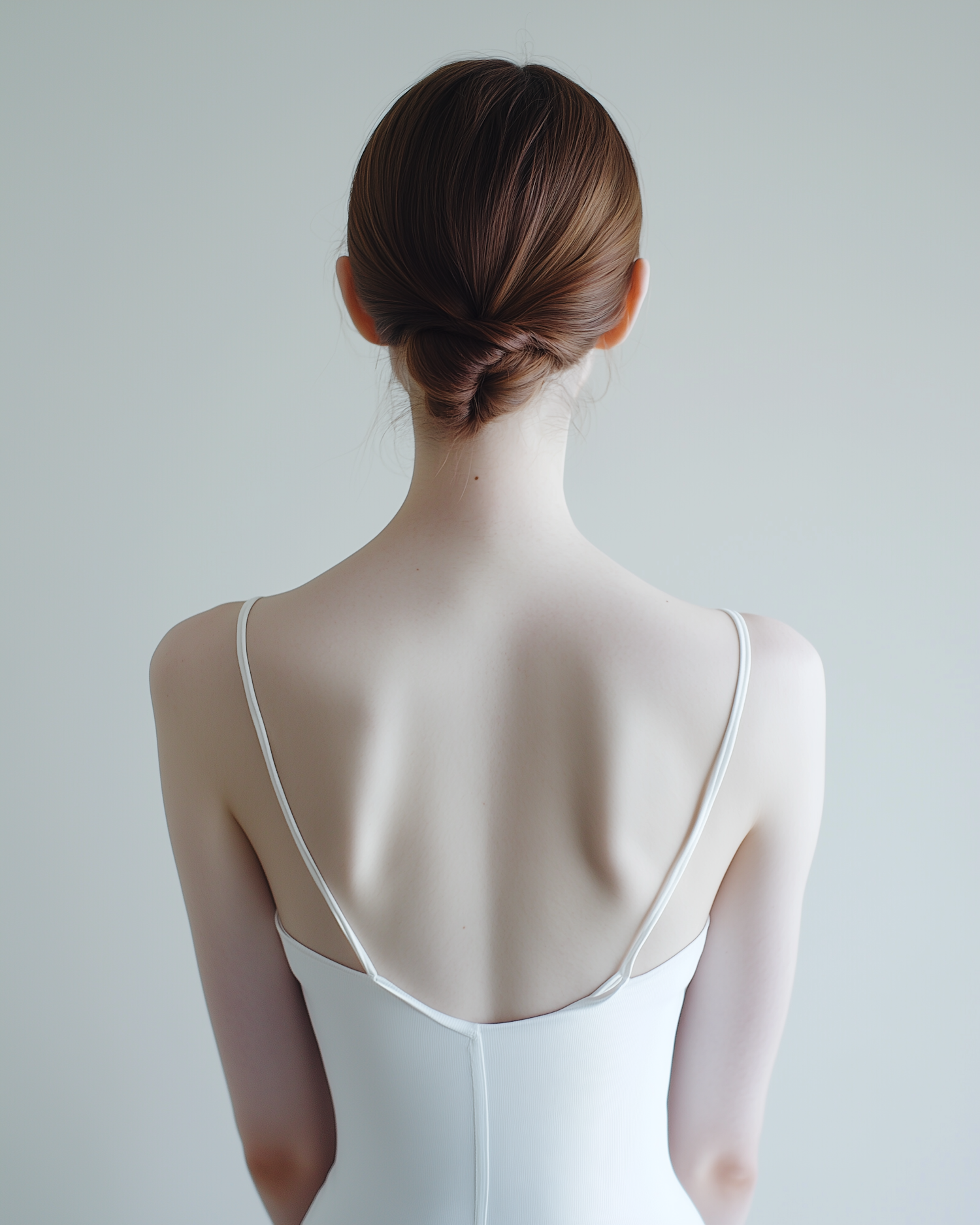 Minimalist back view of a woman with a neat twisted bun and white dress, set against a soft gray background.