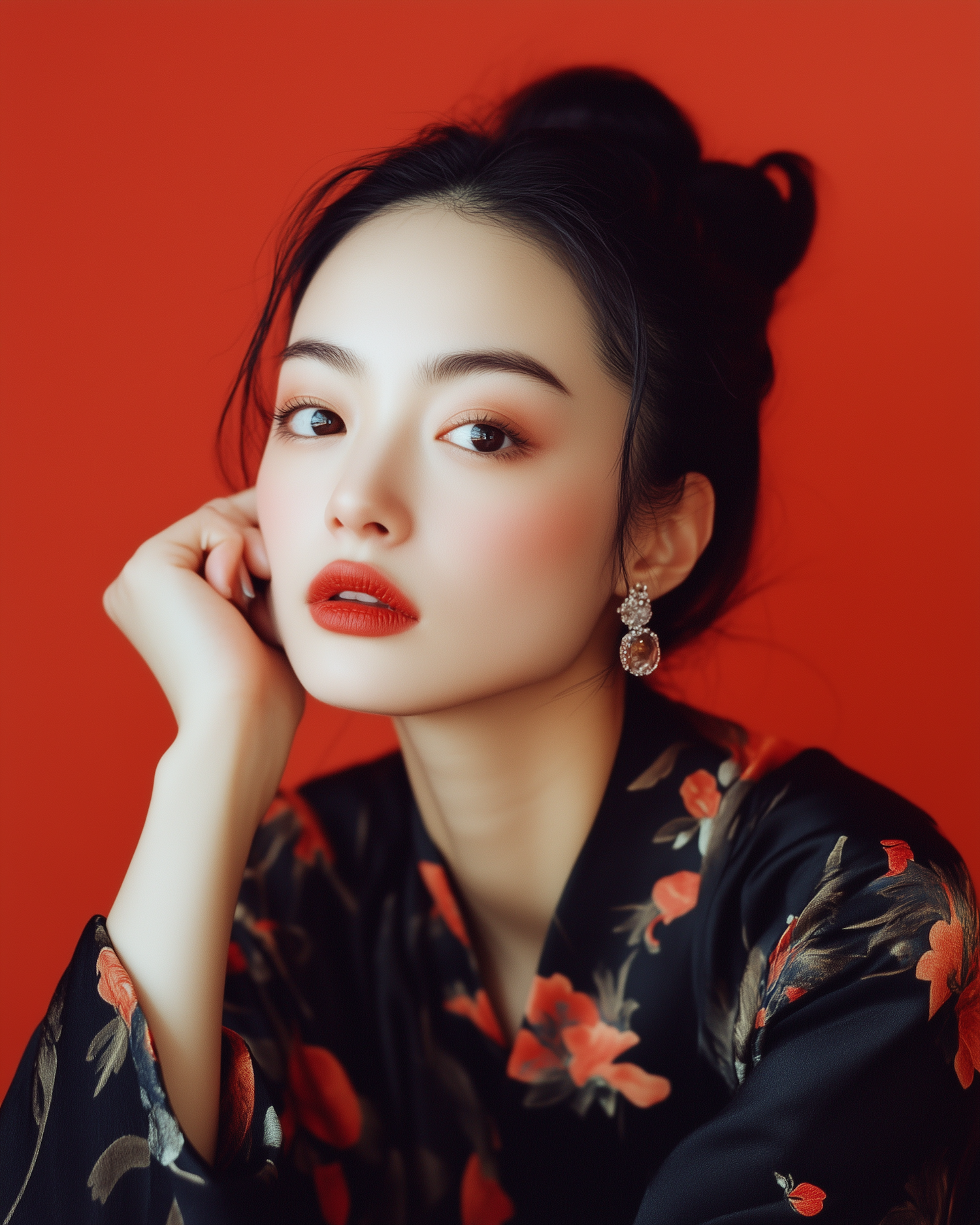 Elegant Asian woman in floral attire with red lipstick and sparkling earrings against a vibrant red background.