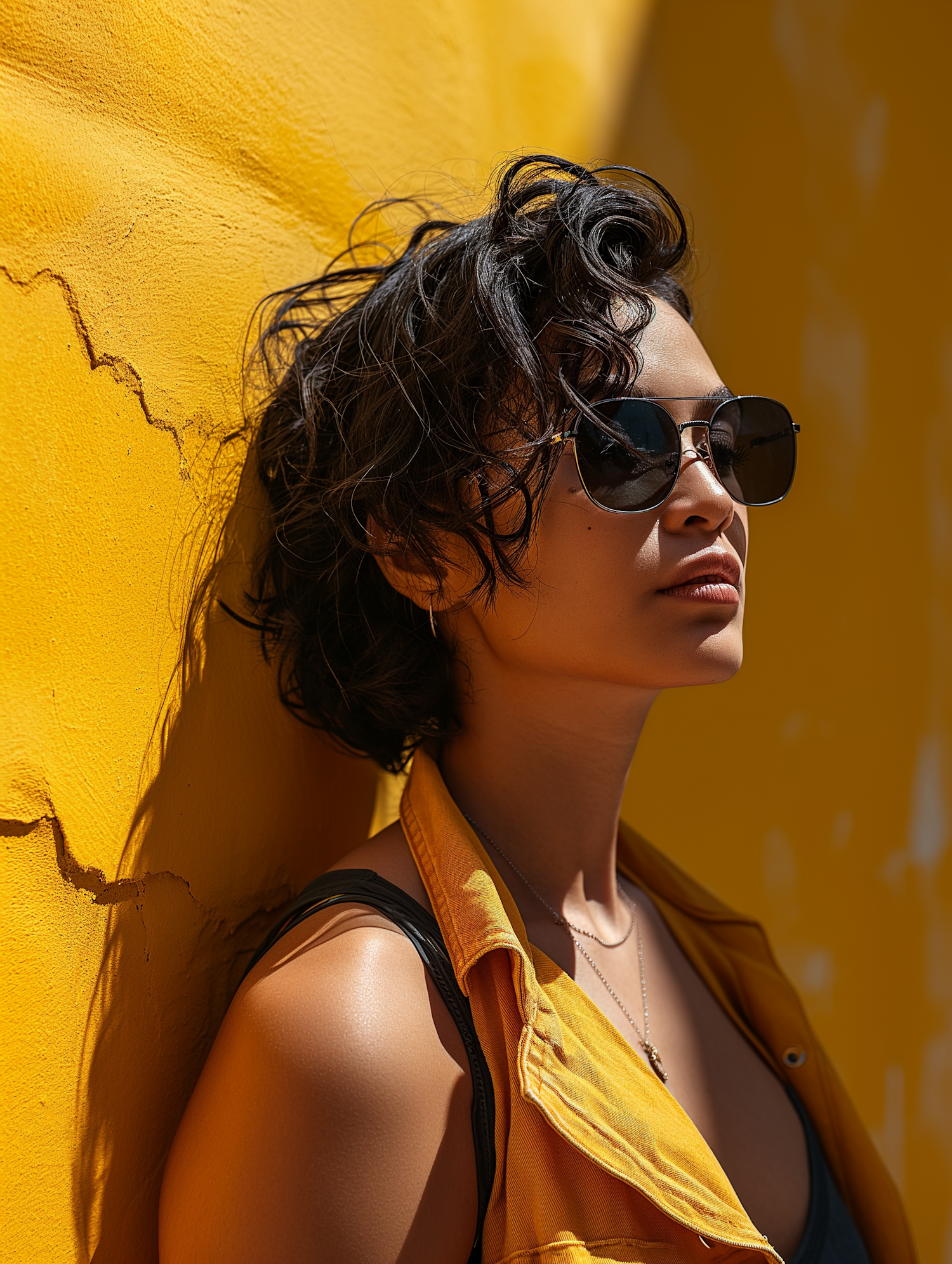 Stylish woman with sunglasses against a vibrant yellow wall, exuding confidence and elegance in a sunlit urban setting.